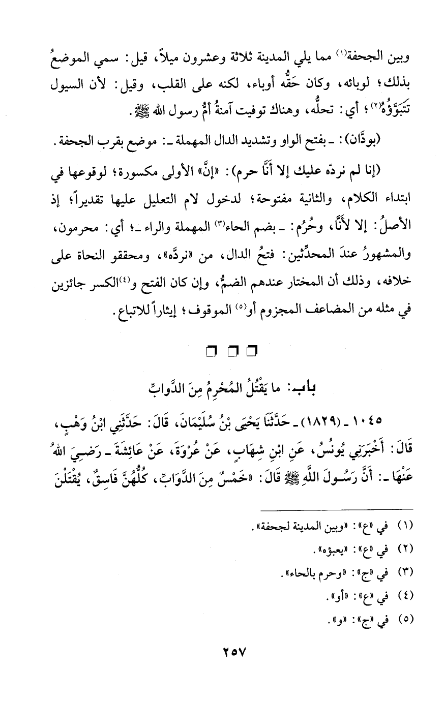 1045 - (1829) - حَدَّثَنَا يَحْيىَ بْنُ سُلَيْمَانَ، قَالَ: حَدَّثَنِي ابْنُ وَهْبٍ، قَالَ: أَخْبَرَنِي يُونُسُ، عَنِ ابْنِ شِهَابٍ، عَنْ عُرْوَةَ، عَنْ عَائِشةَ -رَضِيَ اللهُ عَنْهَا -: أَنَّ رَسُولَ اللهِ - صلى الله عليه وسلم - قالَ: "خَمْسٌ مِنَ الدَّوَابِّ، كُلُّهُنَّ فَاسِقٌ، يُقْتَلْنَ