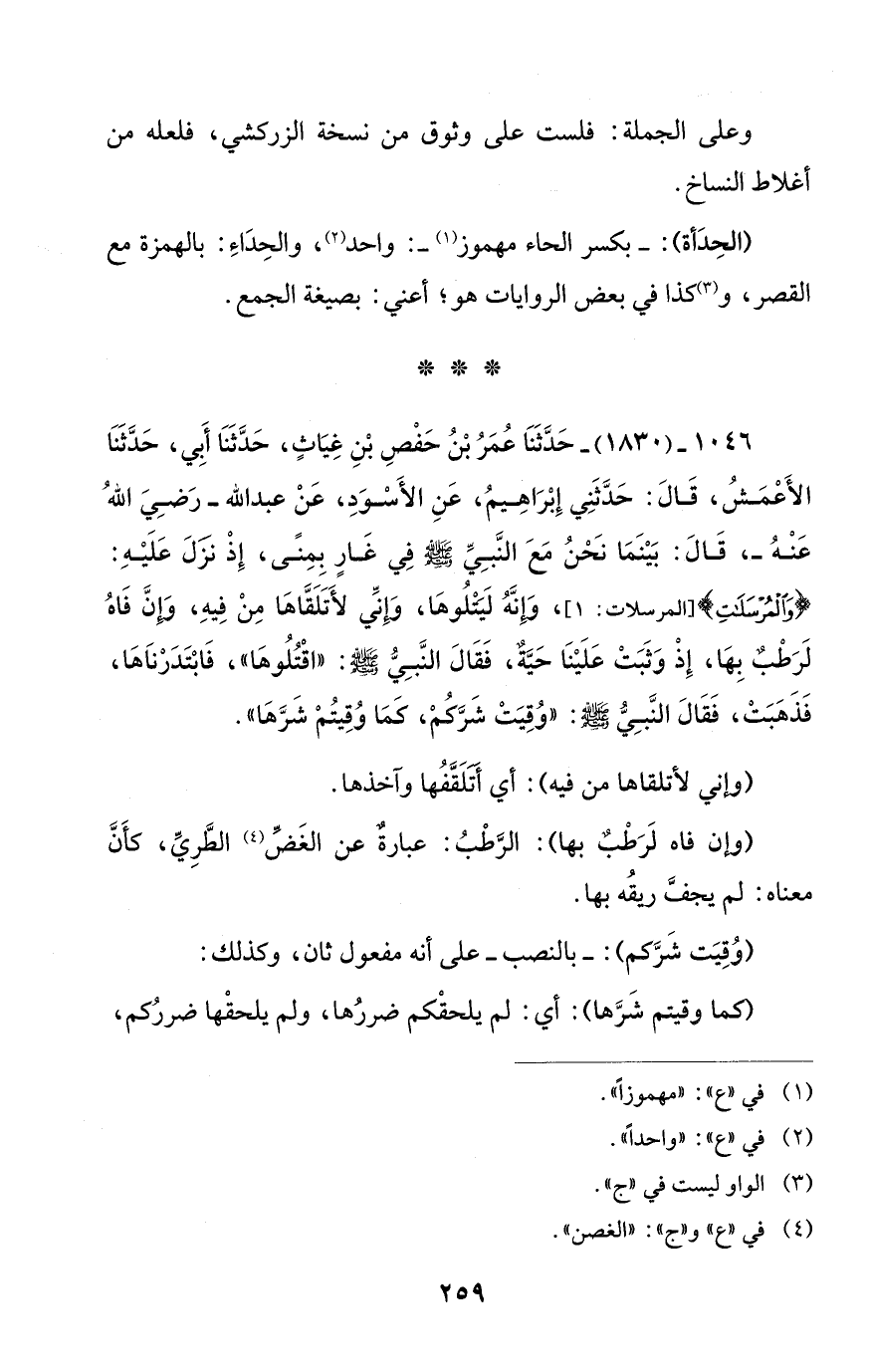1046 - (1830) - حَدَّثَنَا عُمَرُ بْنُ حَفْصِ بْنِ غِيَاثٍ، حَدَّثَنَا أبي، حَدَّثَنَا الأَعْمَشُ، قَالَ: حَدَّثَنِي إِبْرَاهِيمُ، عَنِ الأَسْوَدِ، عَنْ عبد الله -رَضِيَ اللهُ عَنْهُ -، قَالَ: بَيْنَمَا نَحْنُ مَعَ النَّبِيِّ - صلى الله عليه وسلم - فِي غَارٍ بِمِنًى، إِذْ نزَلَ عَلَيْهِ: {وَالْمُرْسَلَاتِ} [المرسلات: 1]، وَإِنَّهُ لَيَتْلُوهَا، وَإِنِّي لأَتَلَقَّاهَا مِنْ فِيهِ، وَإِنَّ فَاهُ لَرَطْبٌ بِهَا، إِذْ وَثَبَتْ عَلَيْنَا حَيَّةٌ، فَقَالَ النَّبِيُّ - صلى الله عليه وسلم -: "اقْتُلُوهَا"، فَابْتَدَرْنَاهَا، فَذَهَبَتْ، فَقَالَ النَّبِيُّ - صلى الله عليه وسلم -: "وُقِيَتْ شَرَّكُمْ، كمَا وُقِيتُمْ شَرَّهَا".