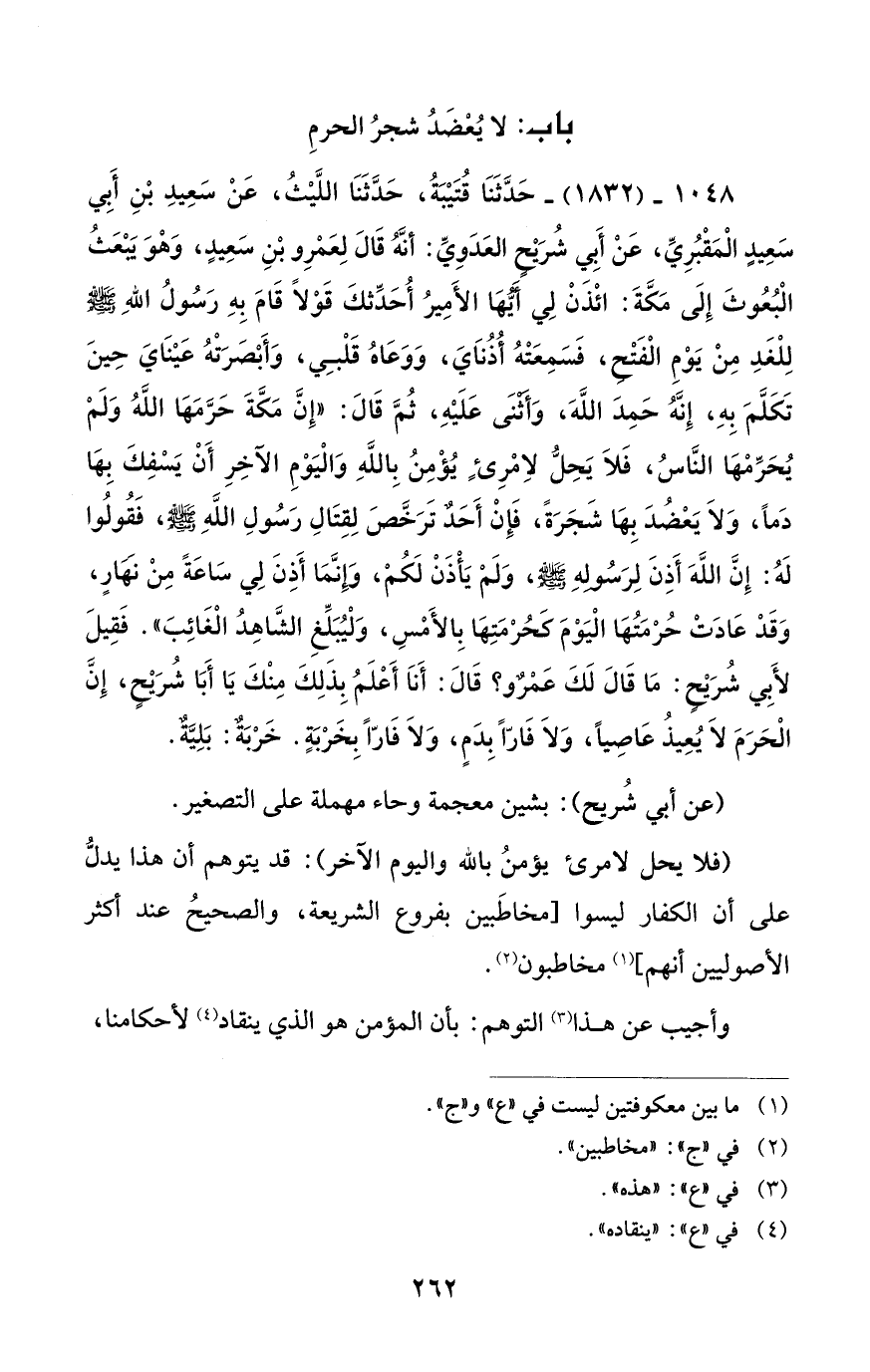 1048 - (1832) - حَدَّثَنَا قُتَيْبَةُ، حَدَّثَنَا اللَّيْثُ، عَنْ سَعِيدِ بْنِ أَبِي سَعِيدٍ الْمَقْبُرِيِّ، عَنْ أَبِي شُرَيْحِ العَدَوِيِّ: أنَّهُ قَالَ لِعَمْرِو بْنِ سَعِيدٍ، وَهْوَ يَبْعَثُ الْبُعُوثَ إِلَى مَكَّةَ: ائْذَنْ لِي أَيُهَا الأَمِيرُ أُحَدِّثكَ قَوْلاً قَامَ بِهِ رَسُولُ اللهِ - صلى الله عليه وسلم - لِلْغَدِ مِنْ يَوْمِ الْفَتْحِ، فَسَمِعَتْهُ أُذُنَايَ، وَوَعَاهُ قَلْبِي، وَأَبْصَرَتْهُ عَيْنَايَ حِينَ تَكَلَّمَ بِهِ، إِنَّهُ حَمِدَ اللهَ، وَأَثْنَى عَلَيْهِ، ثُمَّ قَالَ: "إِنَّ مَكَّةَ حَرَّمَهَا اللهُ وَلَمْ يُحَرِّمْهَا النَّاسُ، فَلاَ يَحِلُّ لاِمْرِئٍ يُؤْمِنُ بِاللهِ وَالْيَوْمِ الآخِرِ أَنْ يَسْفِكَ بِهَا دَماً، وَلاَ يَعْضُدَ بِهَا شَجَرَةً، فَإِنْ أَحَدٌ تَرَخَّصَ لِقِتَالِ رَسُولِ اللهِ - صلى الله عليه وسلم -، فَقُولُوا لَهُ: إِنَّ اللهَ أَذِنَ لِرَسُولهِ - صلى الله عليه وسلم -، وَلَمْ يَأْذَنْ لَكُمْ، وَإِنَّمَا أَذِنَ لِي سَاعَةً مِنْ نَهَارٍ، وَقَدْ عَادَتْ حُرْمَتُهَا الْيَوْمَ كحُرْمَتِهَا بِالأَمْسِ، وَلْيُبَلِّغِ الشَّاهِدُ الْغَائِبَ". فَقِيلَ لأَبِي شُرَيْحٍ: مَا قَالَ لَكَ عَمْروٌ؟ قَالَ: أَنَا أَعْلَمُ بِذلِكَ مِنْكَ يَا أَبَا شُرَيْحٍ، إِنَّ الْحَرَمَ لَا يُعِيذُ عَاصِياً، وَلاَ فَارًّا بِدَمٍ، وَلاَ فَارًّا بِخَرْبَةٍ. خَرْبَة: بَلِيَّةٌ.
