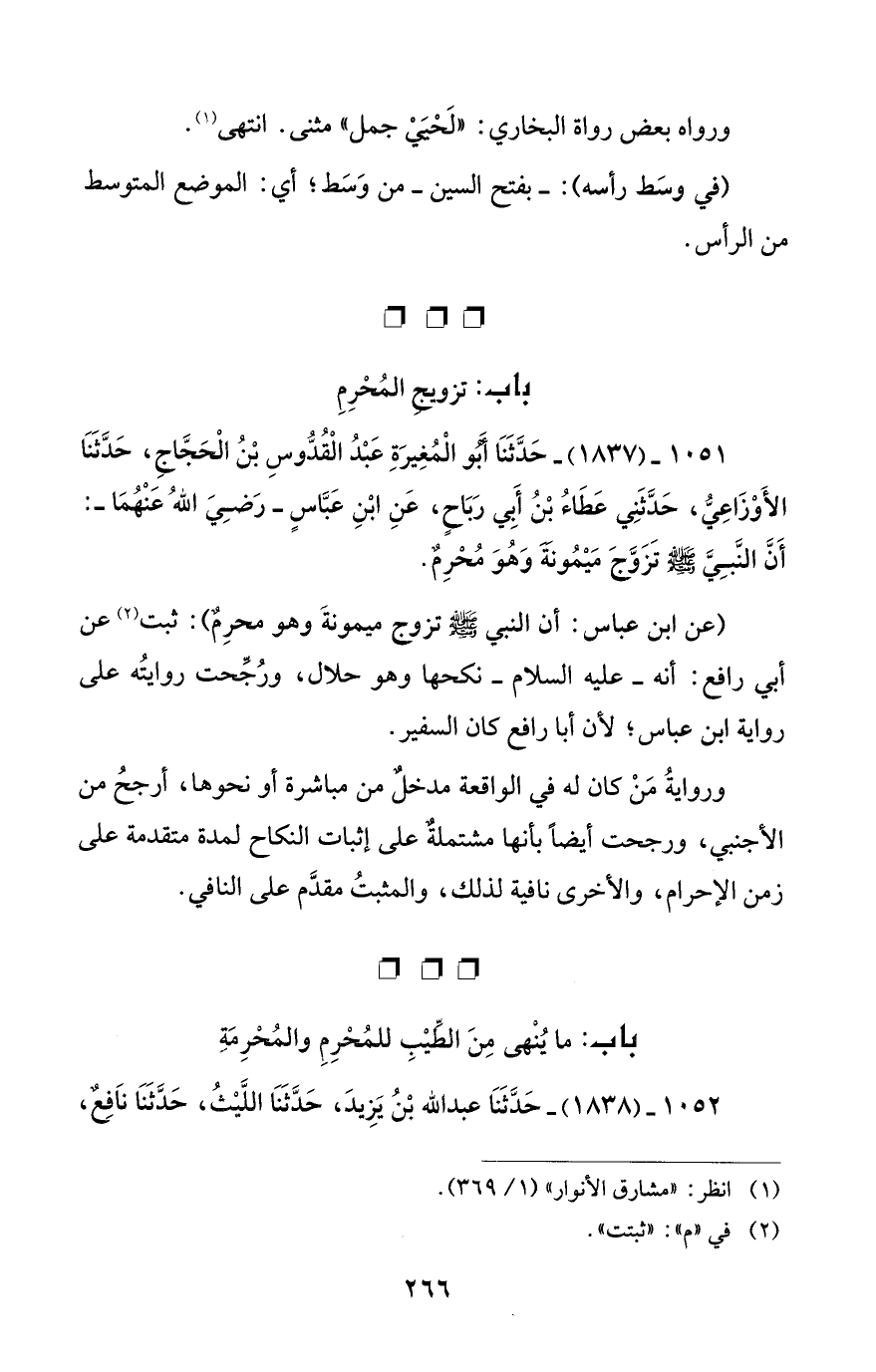 1051 - (1837) - حَدَّثَنَا أَبُو الْمُغِيرَةِ عَبْدُ الْقُدُّوسِ بْنُ الْحَجَّاجِ، حَدَّثَنَا الأَوْزَاعِيِّ، حَدَّثَنِي عَطَاءُ بْنُ أَبي رَبَاحٍ، عَنِ ابْنِ عَبَّاسٍ -رَضِيَ اللهُ عَنْهُمَا -: أَنَّ النَّبِيَّ - صلى الله عليه وسلم - تَزَوَّجَ مَيْمُونَةَ وَهُوَ مُحْرِمٌ.