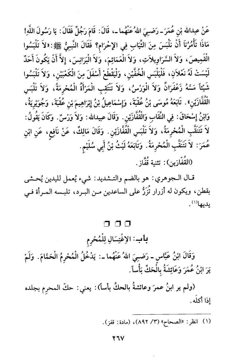 عَنْ عبد الله بْنِ عُمَرَ -رَضِيَ اللهُ عَنْهُما-، قَالَ: قَامَ رَجُلٌ فَقَالَ: يَا رَسُولَ اللهِ! مَاذَا تَأْمُرُنَا أَنْ نلْبَسَ مِنَ الثِّيَابِ فِي الإِحْرَامِ؟ فَقَالَ النَّبِيُّ - صلى الله عليه وسلم -: "لَا تَلْبَسُوا الْقَمِيصَ، وَلاَ السَّرَاوِيلاَتِ، وَلاَ الْعَمَائِمَ، وَلاَ الْبَرَانِسَ، إِلاَّ أَنْ يَكُونَ أَحَدٌ لَيْسَتْ لَهُ نَعْلاَنِ، فَلْيَلْبَسِ الْخُفَّيْنِ، وَلْيَقْطَعْ أَسْفَلَ مِنَ الْكَعْبَيْنِ، وَلاَ تَلْبَسُوا شَيْئاً مَسَّهُ زَعْفَرَانٌ وَلاَ الْوَرْسُ، وَلاَ تَنْتَقِبِ الْمَرْأَةُ الْمُحْرِمَةُ، وَلاَ تَلْبَسِ الْقُفَّازَينِ". تَابَعَهُ مُوسَى بْنُ عُقْبَةَ، وَإِسْمَاعِيلُ بْنُ إِبْرَاهِيمَ بْنِ عُقْبَةَ، وَجُوَيْرِيَةُ، وَابْنُ إِسْحَاقَ: فِي النِّقَابِ وَالْقُفَّازَيْنِ. وَقَالَ عبيد الله: وَلاَ وَرْسٌ. وَكَانَ يَقُولُ: لَا تَتَنَقَّبِ الْمُحْرِمَةُ، وَلاَ تَلْبَسِ الْقُفَّازينِ. وَقَالَ مَالِكٌ، عَنْ نَافِعٍ، عَنِ ابْنِ عُمَرَ: لَا تَتَنَقَّبِ الْمُحْرِمَةُ. وَتَابَعَهُ لَيْثُ بْنُ أَبِي سُلَيْمِ.