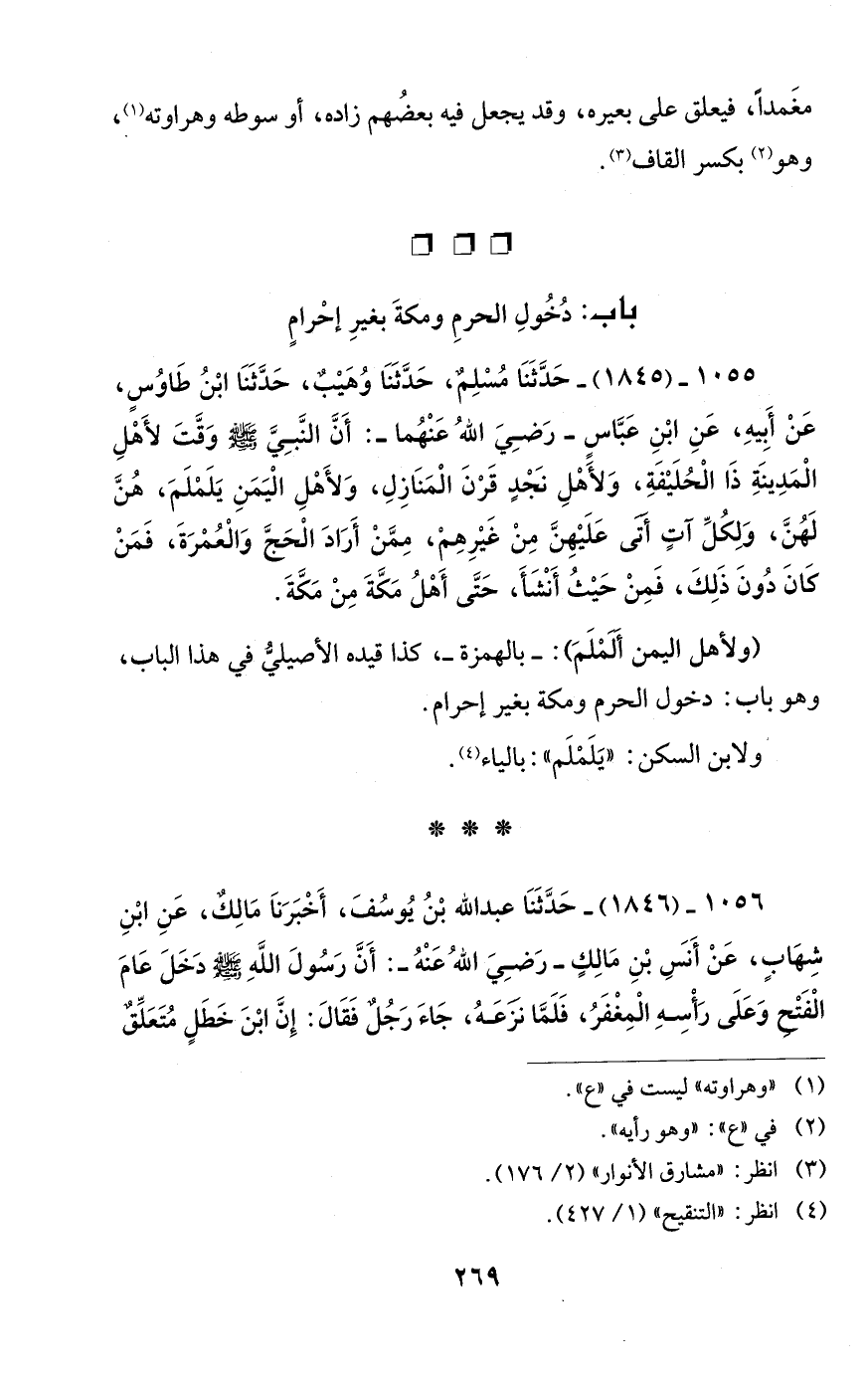1056 - (1846) - حَدَّثَنَا عبد الله بْنُ يُوسُفَ، أَخْبَرَنَا مَالِكٌ، عَنِ ابْنِ شِهَابٍ، عَنْ أَنَسِ بْنِ مَالِكٍ -رَضِيَ اللهُ عَنْهُ -: أَنَّ رَسُولَ اللهِ - صلى الله عليه وسلم - دَخَلَ عَامَ الْفَتْحِ وَعَلَى رَأْسِهِ الْمِغْفَرُ، فَلَمَّا نَزَعَهُ، جَاءَ رَجُلٌ فَقَالَ: إِنَّ ابْنَ خَطَلٍ مُتَعَلِّقٌ