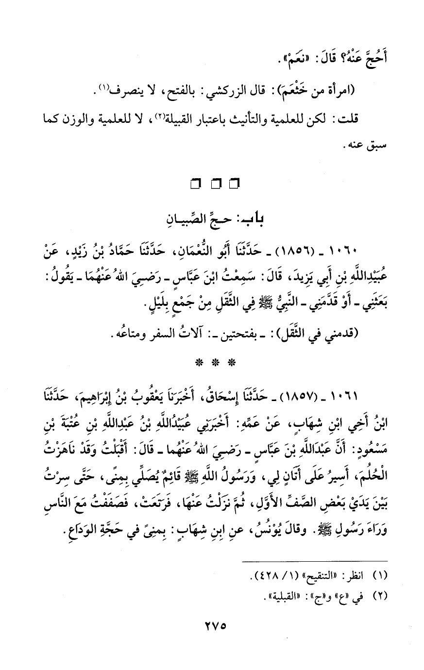 1061 - (1857) - حَدَّثَنَا إِسْحَاقُ، أَخْبَرَنَا يَعْقُوبُ بْنُ إِبْرَاهِيمَ، حَدَّثَنَا ابْنُ أَخِي ابْنِ شِهَابٍ، عَنْ عَمِّهِ: أَخْبَرَنِي عُبَيْدُ اللهِ بْنُ عَبْدِ اللهِ بْنِ عُتْبَةَ بْنِ مَسْعُودٍ: أَنَّ عَبْدَ اللهِ بْنَ عَبَّاسٍ -رَضِيَ اللهُ عَنْهُما - قَالَ: أَقْبَلْتُ وَقَدْ نَاهَزْتُ الْحُلُمَ، أَسِيرُ عَلَى أَتَانٍ لِي، وَرَسُولُ اللهِ - صلى الله عليه وسلم - قَائِمٌ يُصَلِّي بِمِنًى، حَتَّى سِرْتُ بَيْنَ يَدَيْ بَعْضِ الصَّفِّ الأَوَّلِ، ثُمَّ نَزَلْتُ عَنْهَا، فَرَتَعَتْ، فَصَفَفْتُ مَعَ النَّاسِ وَرَاءَ رَسُولِ - صلى الله عليه وسلم -. وقالَ يُوْنُسُ، عنِ ابِنِ شِهَابٍ: بِمنِىً في حَجَّةِ الوَدَاعِ.
