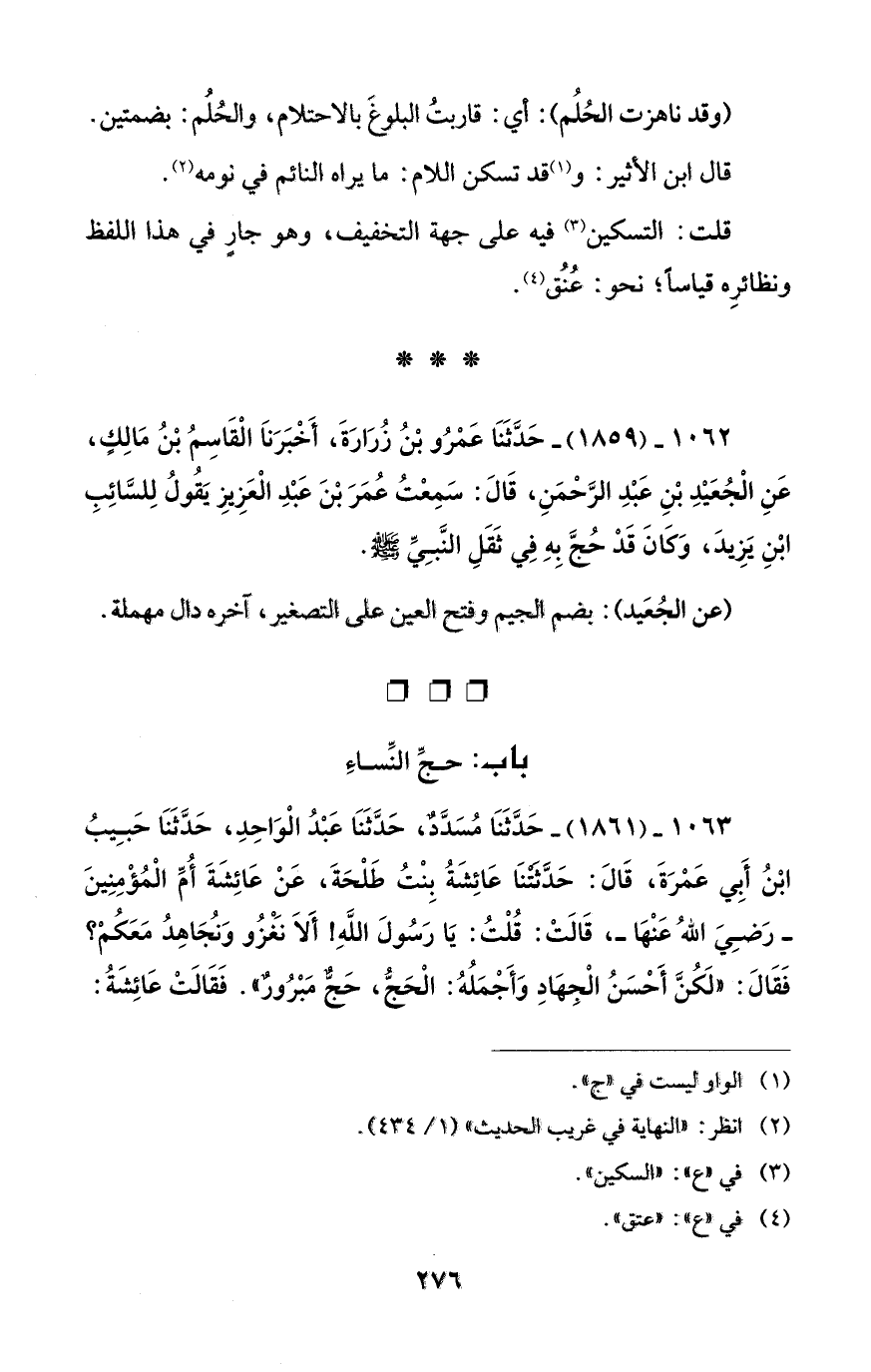 1062 - (1859) - حَدَّثَنَا عَمْرُو بْنُ زُرَارَةَ، أَخْبَرَنَا الْقَاسِمُ بْنُ مَالِكٍ، عَنِ الْجُعَيْدِ بْنِ عَبْدِ الرَّحْمَنِ، قَالَ: سَمِعْتُ عُمَرَ بْنَ عَبْدِ الْعَزِيزِ يَقُولُ لِلسَّائِبِ ابْنِ يَزِيدَ، وَكَانَ قَدْ حُجَّ بِهِ فِي ثَقَلِ النَّبِيِّ - صلى الله عليه وسلم -.