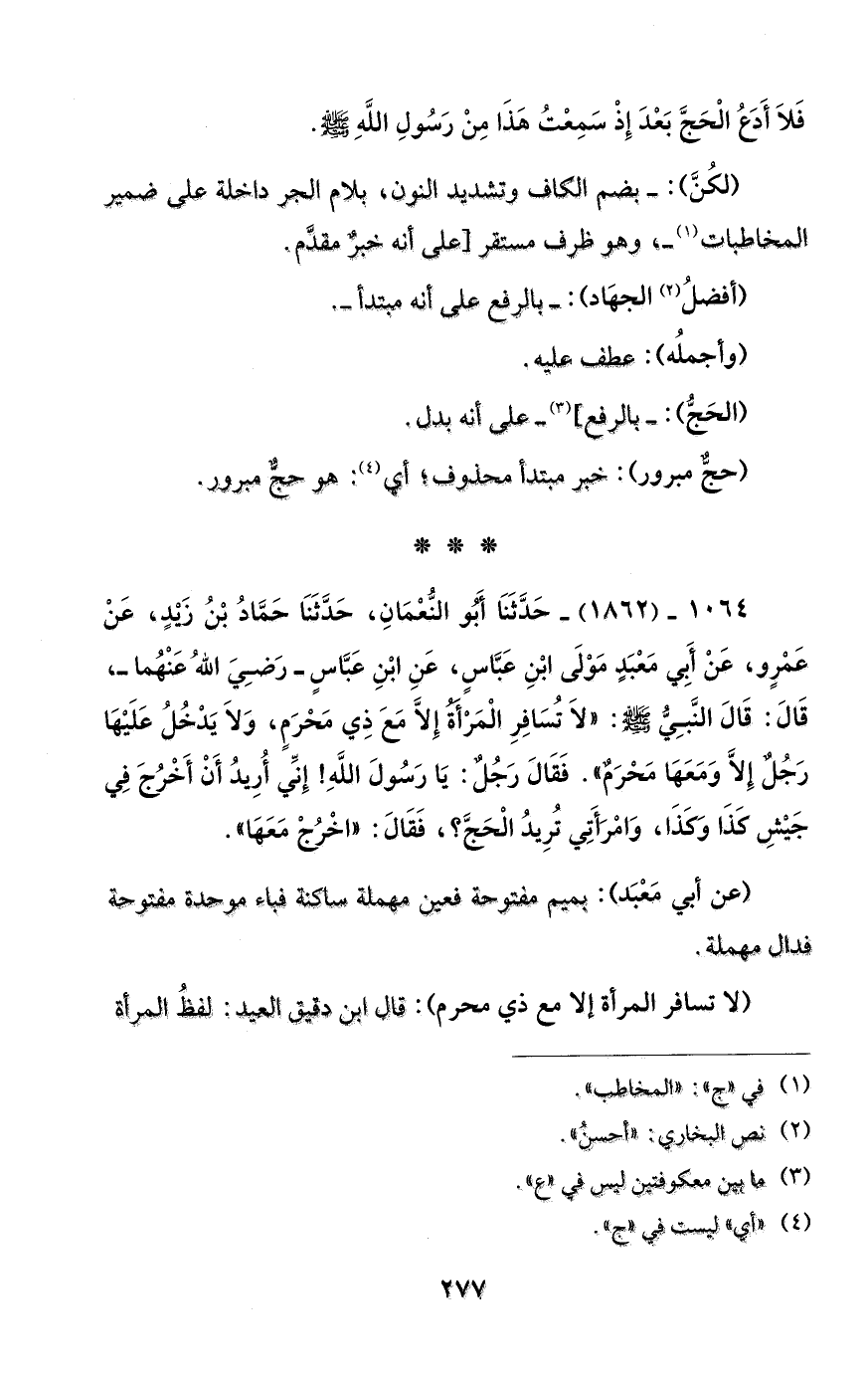 1064 - (1862) - حَدَّثَنَا أَبُو النُّعْمَانِ، حَدَّثَنَا حَمَّادُ بْنُ زَيْدٍ، عَنْ عَمْرٍو، عَنْ أَبي مَعْبَدٍ مَوْلَى ابْنِ عَبَّاسٍ، عَنِ ابْنِ عَبَّاسٍ -رَضِيَ اللهُ عَنْهُما -، قَالَ: قَالَ النَّبِيُّ - صلى الله عليه وسلم -: "لَا تُسَافِرِ الْمَرْأَةُ إِلاَّ مَعَ ذِي مَحْرَمٍ، وَلاَ يَدْخُلُ عَلَيْهَا رَجُلٌ إِلاَّ وَمَعَهَا مَحْرَمٌ". فَقَالَ رَجُلٌ: يَا رَسُولَ اللهِ! إِنِّي أُرِيدُ أَنْ أَخْرُجَ فِي جَيْشِ كَذَا وَكَذَا، وَامْرَأَتِي تُرِيدُ الْحَجَّ؟، فَقَالَ: "اخْرُجْ مَعَهَا".