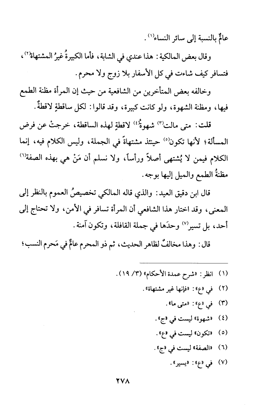 قال ابن دقيق العيد: والذي قاله المالكي تخصيصُ العموم بالنظر إلى المعنى، وقد اختار هذا الشافعي أن المرأة تسافر في الأمن، ولا تحتاج إلى أحد، بل تسير (¬7) وحدَها في جملة القافلة، وتكون آمنة.