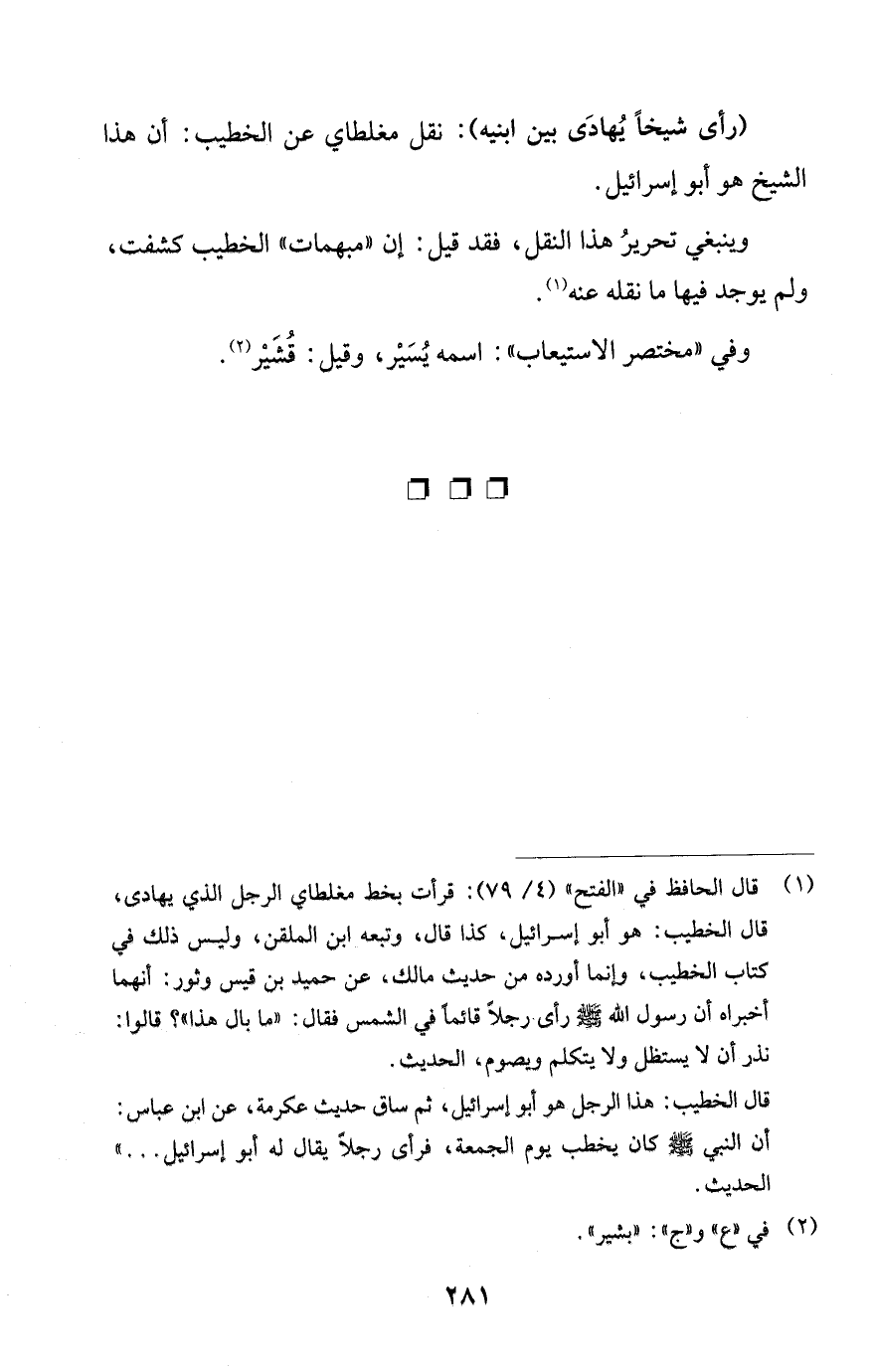 (رأى شيخاً يُهادَى بين ابنيه): نقل مغلطاي عن الخطيب: أن هذا الشيخ هو أبو إسرائيل.