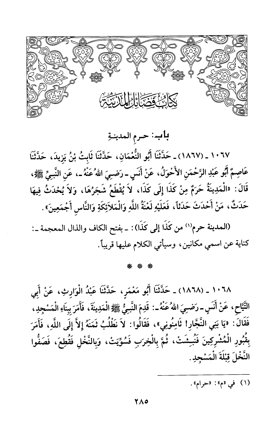 1067 - (1867) - حَدَّثَنَا أَبُو النُّعْمَانِ، حَدَّثَنَا ثَابِتُ بْنُ يَزِيدَ، حَدَّثَنَا عَاصِمٌ أَبُو عَبْدِ الرَّحْمَنِ الأَحْوَلُ، عَنْ أَنسٍ -رَضِيَ اللهُ عَنْهُ -، عَنِ النَّبِيِّ - صلى الله عليه وسلم -، قَالَ: "الْمَدِينَةُ حَرَمٌ مِنْ كَذَا إِلَى كَذَا، لَا يُقْطَعُ شَجَرُهَا، وَلاَ يُحْدَثُ فِيهَا حَدَثٌ، مَنْ أَحْدَثَ حَدَثاً، فَعَلَيْهِ لَعْنَةُ اللهِ وَالْمَلاَئِكَةِ وَالنَّاسِ أَجْمَعِينَ".