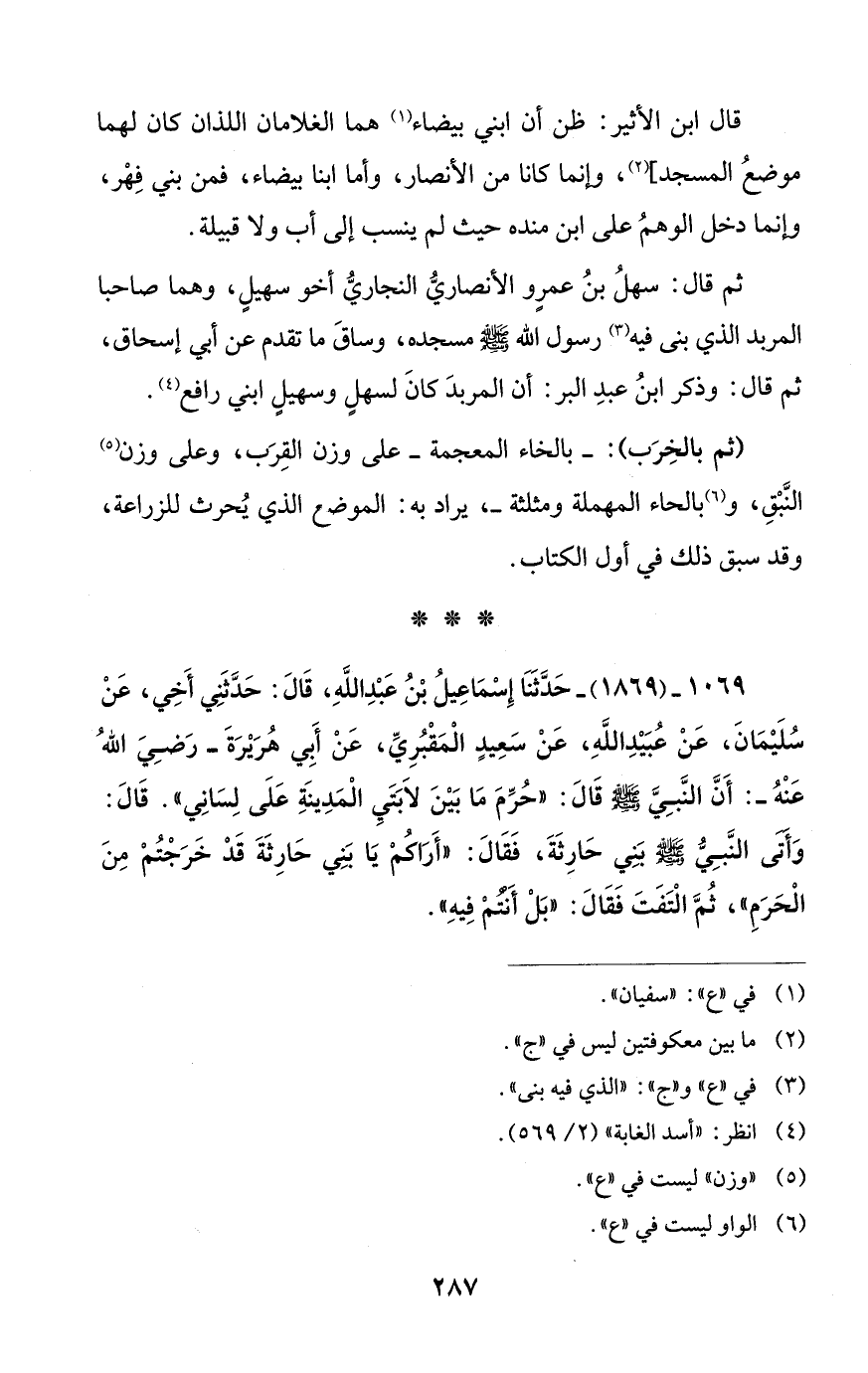 1069 - (1869) - حَدَّثَنَا إِسْمَاعِيلُ بْنُ عَبْدِ اللهِ، قَالَ: حَدَّثَنِي أَخِي، عَنْ سُلَيْمَانَ، عَنْ عُبَيْدِ اللهِ، عَنْ سَعِيدٍ الْمَقْبُرِيِّ، عَنْ أَبِي هُرَيْرَةَ -رَضِيَ اللهُ عَنْهُ -: أَنَّ النَّبِيَّ - صلى الله عليه وسلم - قَالَ: "حُرِّمَ مَا بَيْنَ لاَبَتَيِ الْمَدِينَةِ عَلَى لِسَانِي". قَالَ: وَأَتَى النَّبِيُّ - صلى الله عليه وسلم - بَنِي حَارِثَةَ، فَقَالَ: "أَرَاكُمْ يَا بَنِي حَارِثَةَ قَدْ خَرَجْتُمْ مِنَ الْحَرَمِ"، ثُمَّ الْتَفَتَ فَقَالَ: "بَلْ أَنْتُمْ فِيهِ".