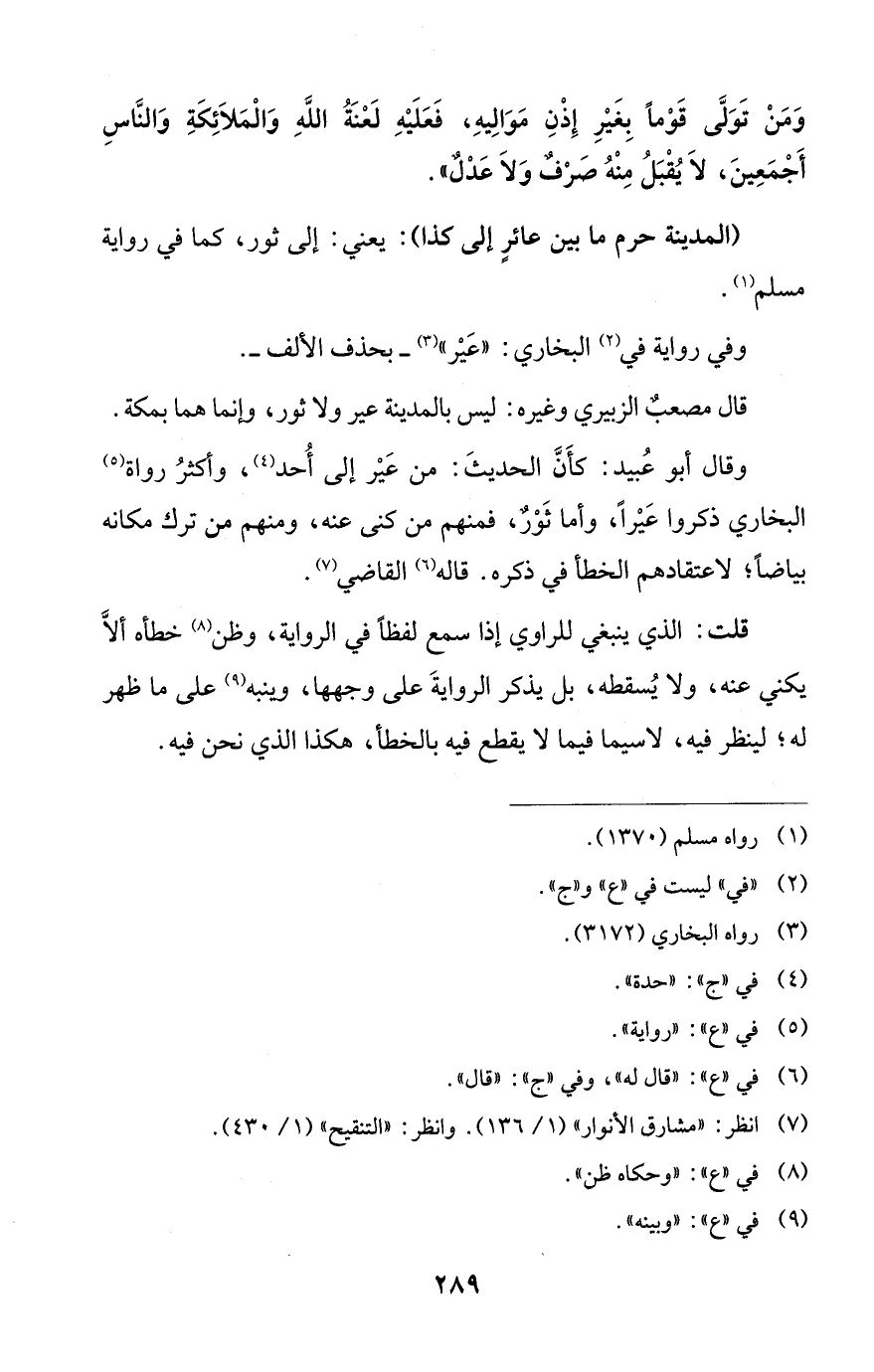 وقال أبو عُبيد: كأَنَّ الحديثَ: من عَيْر إلى أُحد (¬4)، وأكثرُ رواة (¬5) البخاري ذكروا عَيْراً، وأما ثَوْرٌ، فمنهم من كنى عنه، ومنهم من ترك مكانه بياضاً؛ لاعتقادهم الخطأ في ذكره. قاله (¬6) القاضي (¬7).