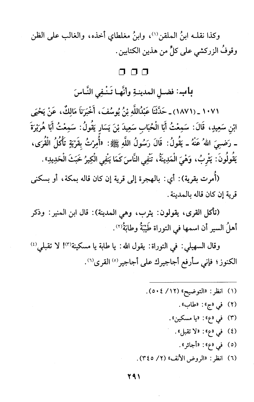 1071 - (1871) - حَدَّثَنَا عَبْدُ اللهِ بْنُ يُوسُفَ، أَخْبَرَنَا مَالِكٌ، عَنْ يَحْيىَ ابْنِ سَعِيدٍ، قَالَ: سَمِعْتُ أَبَا الْحُبَابِ سَعِيدَ بْنَ يَسَارٍ يَقُولُ: سَمِعْتُ أَبَا هُرَيْرَةَ -رَضِيَ اللهُ عَنْهُ- يَقُولُ: قَالَ رَسُولُ اللهِ - صلى الله عليه وسلم -: "أُمِرْتُ بِقَرْيَةٍ تَأْكُلُ الْقُرى، يَقُولُونَ: يَثْربُ، وَهْيَ الْمَدِينَةُ، تَنْفِي النَّاسَ كمَا يَنْفِي الْكِيرُ خَبَثَ الْحَدِيدِ".