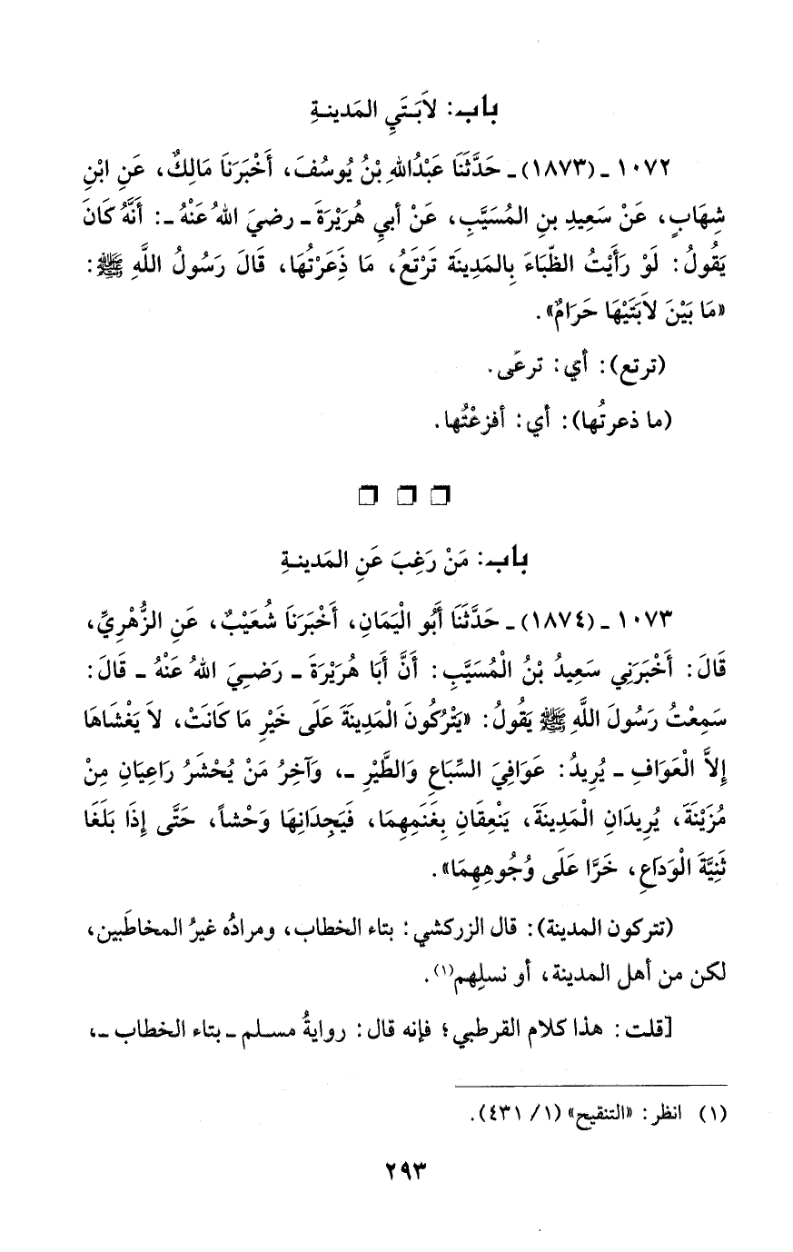 1072 - (1873) - حَدَّثَنَا عَبْدُ اللهِ بْنُ يُوسُفَ، أَخْبَرَنَا مَالِكٌ، عَنِ ابْنِ شِهَابٍ، عَنْ سَعِيدِ بنِ المُسَيَّبِ، عَنْ أبيِ هُرَيْرَةَ -رضيَ اللهُ عَنْهُ -: أَنَّهُ كَانَ يَقُولُ: لَوْ رَأَيْتُ الظّبَاءَ بِالمَدِينَة تَرْتَعُ، مَا ذِعَرْتُهَا، قَالَ رَسُولُ اللهِ - صلى الله عليه وسلم -: "مَا بَيْنَ لاَبَتَيْهَا حَرَامٌ".