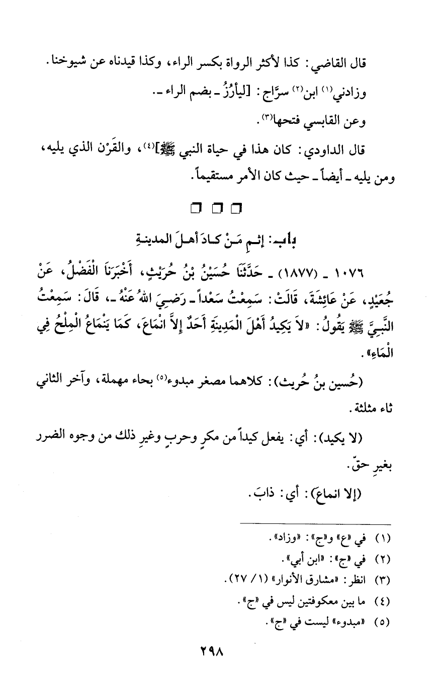 1076 - (1877) - حَدَّثَنَا حُسَيْنُ بْنُ حُرَيْثٍ، أَخْبَرَنَا الْفَضْلُ، عَنْ جُعَيْدٍ، عَنْ عَائِشَةَ، قَالَتْ: سَمِعْتُ سَعْداً -رَضِيَ اللهُ عَنْهُ -، قَالَ: سَمِعْتُ النَّبِيَّ - صلى الله عليه وسلم - يَقُولُ: "لَا يَكِيدُ أَهْلَ الْمَدِينَةِ أَحَدٌ إِلاَّ انْمَاعَ، كَمَا يَنْمَاعُ الْمِلْحُ فِي الْمَاءِ".