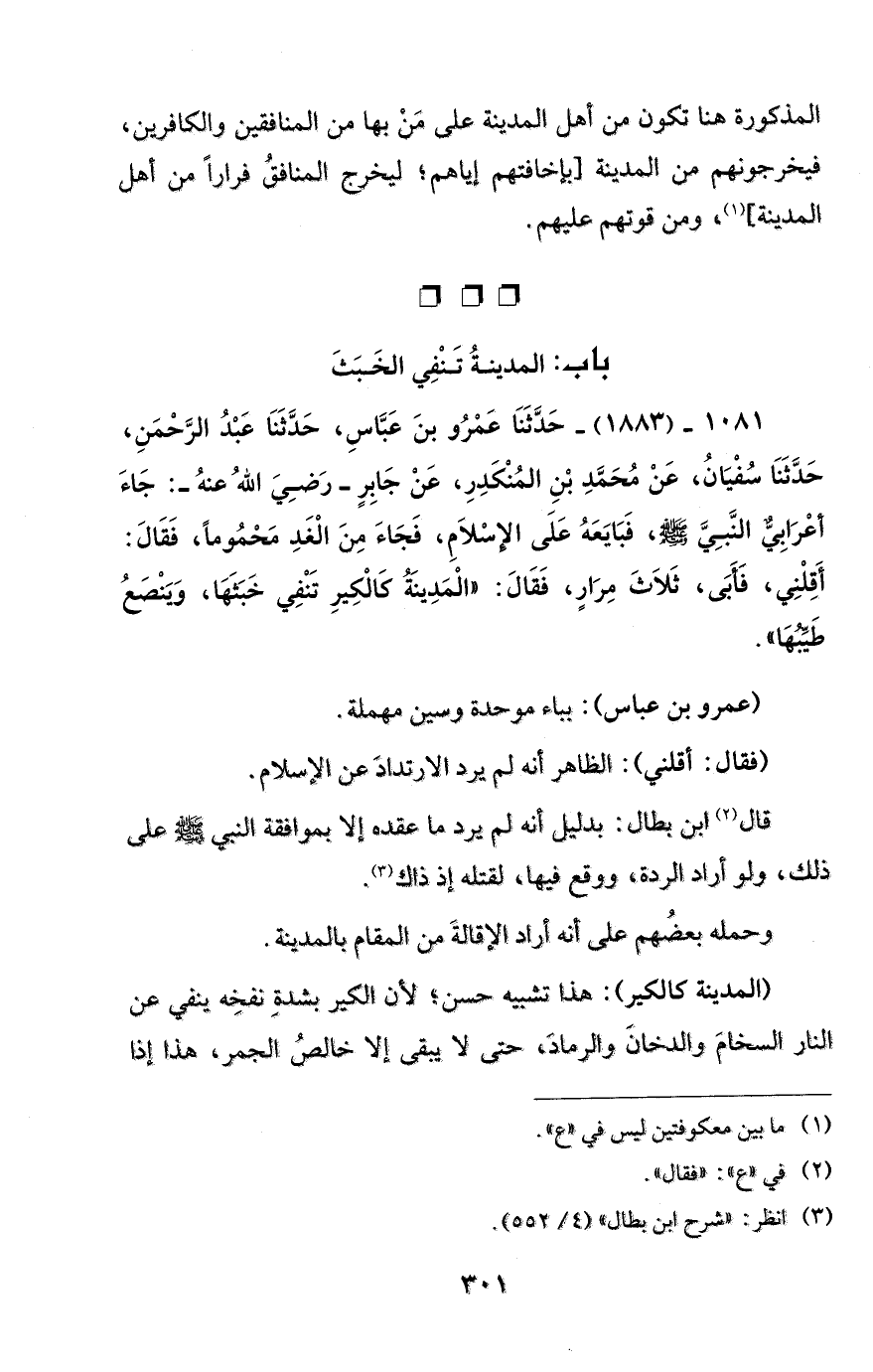 1081 - (1883) - حَدَّثَنَا عَمْرُو بنَ عَبَّاسِ، حَدَّنَثَا عَبْدُ الرَّحْمَنِ، حَدَّثَنَا سُفْيَانُ، عَنْ مُحَمَّدِ بْنِ المُنْكَدِرِ، عَنْ جَابِرٍ -رَضِيَ اللهُ عنهُ -: جَاءَ أعْرَابِيٌّ النَّبِيَّ - صلى الله عليه وسلم -، فَبَايَعَهُ عَلَى الإسْلاَمِ، فَجَاءَ مِنَ الْغَدِ مَحْمُوماً، فَقَالَ: أَقِلْنِي، فَأَبَى، ثَلاَثَ مِرَارٍ، فَقَالَ: "الْمَدِينَةُ كَالْكِيرِ تَنْفِي خَبَثَهَا، وَيَنْصَعُ طَيِّبُهَا".