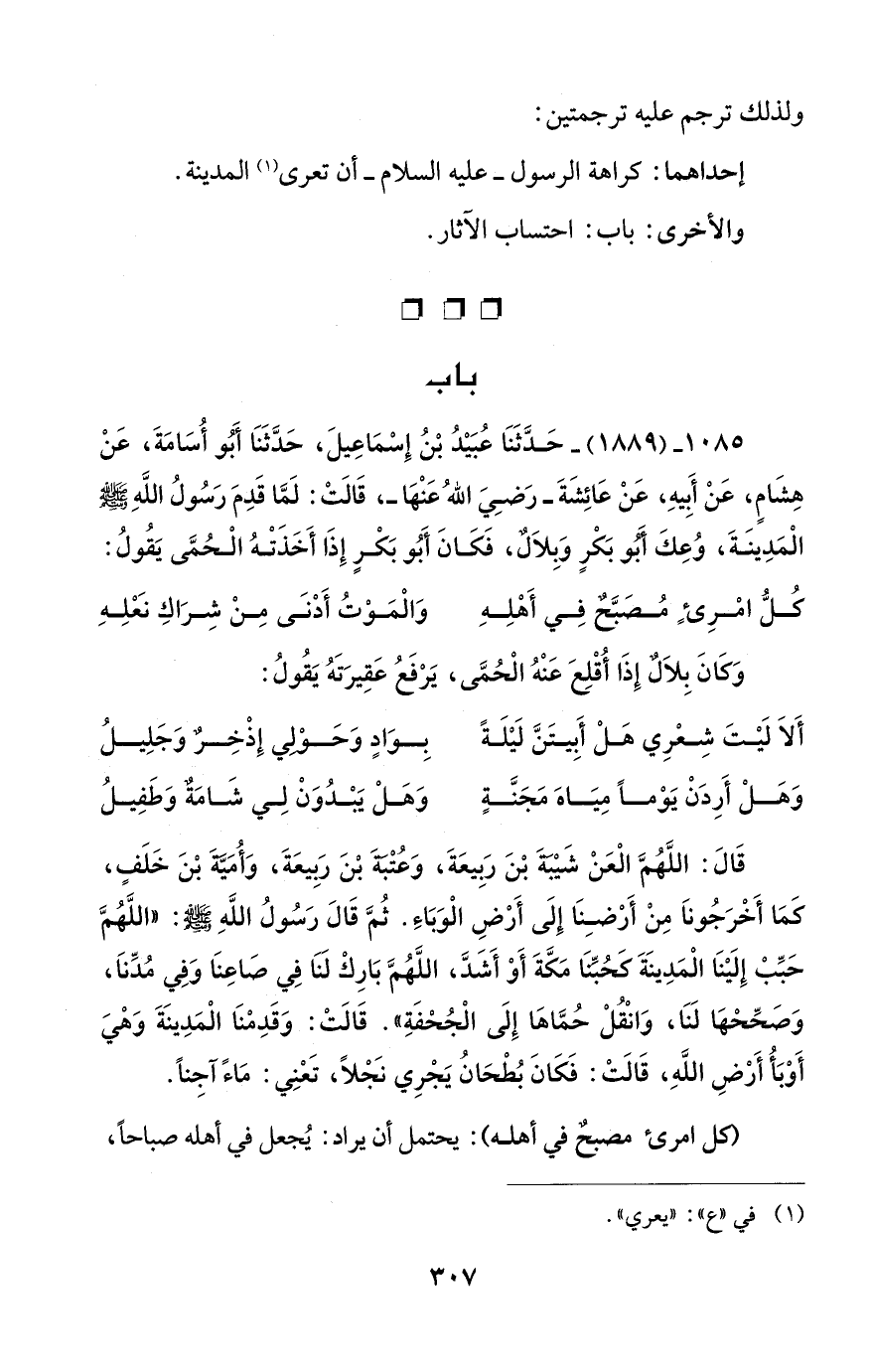 1085 - (1889) - حَدَّثَنَا عُبَيْدُ بْنُ إِسْمَاعِيلَ، حَدَّثَنَا أَبُو أُسَامَةَ، عَنْ هِشَامٍ، عَنْ أَبيهِ، عَنْ عَائِشَةَ -رَضِيَ اللهُ عَنْهَا -، قَالَتْ: لَمَّا قَدِمَ رَسُولُ اللهِ - صلى الله عليه وسلم - الْمَدِينَةَ، وُعِكَ أَبُو بَكْرٍ وَبِلاَلٌ، فَكَانَ أَبُو بَكْرٍ إِذَا أَخَذَتْهُ الْحُمَّى يَقُولُ: