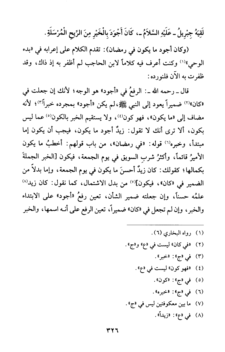 قال -رحمه الله -: الرفعُ في "أجود" هو الوجه؛ لأنك إن جعلت في "كان" (¬2) ضميرًا يعود إلى النبي - صلى الله عليه وسلم -، لم يكن "أجود" بمجرده خبرًا (¬3)؛ لأنه مضاف إلى "ما يكون"، فهو كون (¬4)، ولا يستقيم الخبر بالكون (¬5) عما ليس بكون، ألا ترى أنك لا تقول: زيدٌ أجود ما يكون، فيجب أن يكون إما مبتدأ، وخبره (¬6) قوله: "في رمضان"، من باب قولهم: أخطبُ ما يكون الأميرُ قائمًا، وأكثرُ شربِ السويق في يوم الجمعة، فيكون [الخبر الجملةَ بكمالها؛ كقولك: كان زيدٌ أحسنَ ما يكون في يوم الجمعة، وإما بدلًا من الضمير في "كان"، فيكون] (¬7) من بدل الاشتمال، كما نقول: كان زيد (¬8) علمُه حسنًا، وإن جعلته ضمير الشأن، تعين رفعُ "أجود" على الابتداء والخبر، وإن لم تجعل في "كان" ضميرًا، تعين الرفع على أنه اسمها، والخبر
