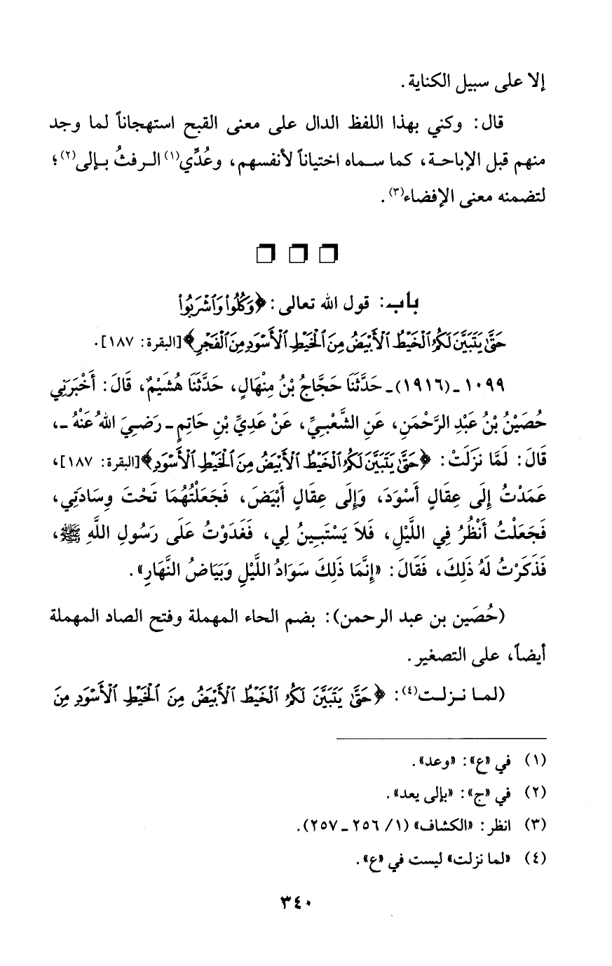 1099 - (1916) - حَدَّثَنَا حَجَّاجُ بْنُ مِنْهَالٍ، حَدَّثَنَا هُشَيْمٌ، قَالَ: أَخْبَرَنِي حُصَيْنُ بْنُ عَبْدِ الرَّحْمَنِ، عَنِ الشَّعْبِيِّ، عَنْ عَدِيِّ بْنِ حَاتِم - رَضِيَ اللهُ عَنْهُ -، قَالَ: لَمَّا نزَلَتْ: {حَتَّى يَتَبَيَّنَ لَكُمُ الْخَيْطُ الْأَبْيَضُ مِنَ الْخَيْطِ الْأَسْوَدِ} [البقرة: 187]، عَمَدْتُ إِلَى عِقَالٍ أَسْوَدَ، وَإِلَى عِقَالٍ أَبْيَضَ، فَجَعَلْتُهُمَا تَحْتَ وِسَادَتِي، فَجَعَلْتُ أَنْظُرُ فِي اللَّيْلِ، فَلاَ يَسْتَبِينُ لِي، فَغَدَوْتُ عَلَى رَسُولِ اللَّهِ - صلى الله عليه وسلم -، فَذَكَرْتُ لَهُ ذَلِكَ، فَقَالَ: "إِنَّمَا ذَلِكَ سَوَادُ اللَّيْلِ وَبَيَاضُ النَّهَارِ".