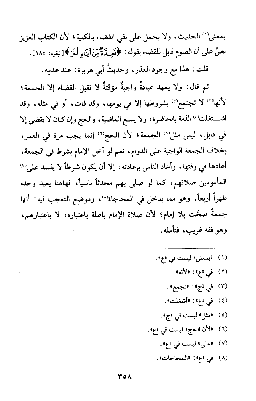 ثم قال: ولا يعهد عبادةٌ واجبةٌ مؤقتةٌ لا تقبل القضاء إلا الجمعة؛ لأنها (¬2) لا تجتمع (¬3) بشروطها إلا في يومها، وقد فات، أو في مثله، وقد اشتغلت (¬4) الذمة بالحاضرة، ولا يسع الماضية، والحج وإن كان لا يقضى إلا في قابل، ليس مثل (¬5) الجمعة؛ لأن الحج (¬6) إنما يجب مرة في العمر، بخلاف الجمعة الواجبة على الدوام، نعم لو أخل الإمام بشرط في الجمعة، أعادها في وقتها، وأعاد الناس بإعادته، إلا أن يكون شرطًا لا يفسد على (¬7) المأمومين صلاتهم، كما لو صلى بهم محدثًا ناسيًا، فهاهنا يعيد وحده ظهرًا أربعًا، وهو مما يدخل في المحاجاة (¬8)، وموضع التعجب فيه: أنها جمعةٌ صحَّت بلا إمام؛ لأن صلاة الإمام باطلة باعتباره، لا باعتبارهم، وهو فقه غريب، فتأمله.
