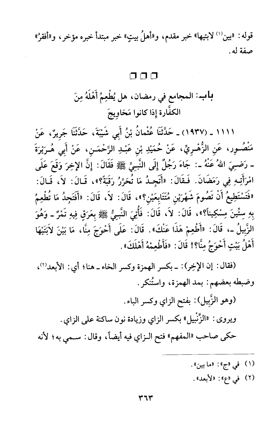 1111 - (1937) - حَدَّثَنَا عُثْمانُ بْنُ أَبي شَيْبَةَ، حَدَّثَنَا جَرِيرٌ، عَنْ مَنْصُورٍ، عَنِ الزُّهْرِيِّ، عَنْ حُمَيدِ بْنِ عَبْدِ الرَحْمَنِ، عَنْ أَبِي هُرَيْرَةَ - رَضِيَ اللهُ عَنْهُ -: جَاءَ رَجُلٌ إِلَى النَّبِيِّ - صلى الله عليه وسلم - فَقَالَ: إِنَّ الإِخِرَ وَقَعَ عَلَى امْرَأَتِهِ فِي رَمَضَانَ. فَقَالَ: "أتجِدُ مَا تحَرِّرُ رَقَبَةً؟ "، قَالَ: لَا، قَالَ: "فتسْتَطِيعُ أَنْ تَصُومَ شَهْرَيْنِ مُتَتَابِعَيْنِ؟ "، قَالَ: لَا، قَالَ: "أَفَتَجِدُ مَا تُطْعِمُ بِهِ سِتِّينَ مِسْكِينًا؟ "، قَالَ: لَا، قَالَ: فَأُتِيَ النَّبِيُّ - صلى الله عليه وسلم - بِعَرَقٍ فِيهِ تَمْرٌ - وَهُوَ الزَّبِيلُ -، قَالَ: "أَطْعِمْ هَذَا عَنْكَ". قَالَ: عَلَى أَحْوَجَ مِنَّا، مَا بَيْنَ لاَبَتَيْهَا أَهْلُ بَيْتٍ أَحْوَجُ مِنَّا؟! قَالَ: "فَأَطْعِمْهُ أَهْلَكَ".