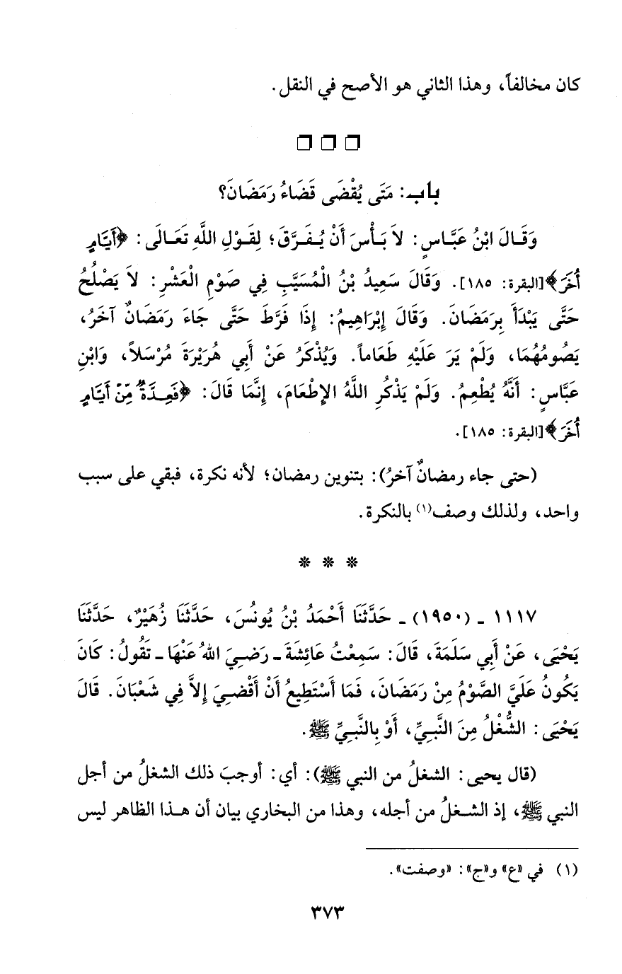 1117 - (1950) - حَدَّثَنَا أَحْمَدُ بْنُ يُونُسَ، حَدَّثَنَا زُهَيْرٌ، حَدَّثَنَا يَحْيَى، عَنْ أَبِي سَلَمَةَ، قَالَ: سَمِعْتُ عَائِشَةَ - رَضِيَ اللهُ عَنْهَا - تَقُولُ: كانَ يَكُونُ عَلَيَّ الصَّوْمُ مِنْ رَمَضَانَ، فَمَا أَسْتَطِيعُ أَنْ أَقْضِيَ إِلاَّ فِي شَعْبَانَ. قَالَ يَحْيَى: الشُّغْلُ مِنَ النَّبِيِّ، أَوْ بِالنَّبِيِّ - صلى الله عليه وسلم -.