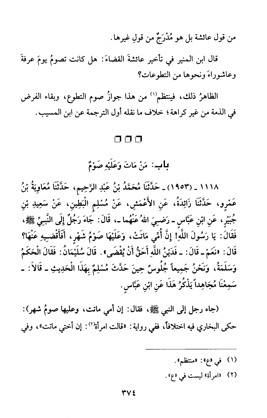 1118 - (1953) - حَدَّثَنَا مُحَمَّدُ بْنُ عَبْدِ الرَّحِيمِ، حَدَّثَنَا مُعَاوِيَةُ بْنُ عَمْرٍو، حَدَّثَنَا زَائِدَةُ، عَنِ الأَعْمَشِ، عَنْ مُسْلِمٍ الْبَطِينِ، عَنْ سَعِيدِ بْنِ جُبَيْرٍ، عَنِ ابْنِ عَبَّاسٍ - رَضِيَ اللهُ عَنْهُما -، قَالَ: جَاءَ رَجُلٌ إِلَى النَّبِيِّ - صلى الله عليه وسلم -، فَقَالَ: يَا رَسُولَ اللهِ! إِنَّ أمِّي مَاتَتْ، وَعَلَيْهَا صَوْمُ شَهْرٍ، أَفَأَقْضِيهِ عَنْهَا؟ قَالَ: "نَعَمْ - قَالَ: - فَدَيْنُ اللهِ أَحَقُّ أَنْ يُقْضَى". قَالَ سُلَيْمَانُ: فَقَالَ الْحَكَمُ وَسَلَمَةُ، وَنَحْنُ جَمِيعًا جُلُوسٌ حِينَ حَدَّثَ مُسْلِمٌ بِهَذَا الْحَدِيثِ - قَالاَ: - سَمِعْنَا مُجَاهِدًا يَذْكُرُ هَذَا عَنِ ابْنِ عَبَّاسٍ.