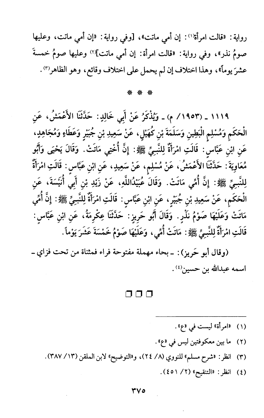 1119 - (1953/ م) - وَيُذْكَرُ عَنْ أَبي خَالِدٍ: حَدَّثَنَا الأَعْمَشُ، عَنِ الْحَكَم وَمُسْلِمٍ الْبَطِينِ وَسَلَمَةَ بْنِ كُهَيْلٍ، عَنْ سَعِيدِ بْنِ جُبَيْرٍ وَعَطَاءً وَمُجَاهِدٍ، عَنِ ابْنِ عَبَّاسٍ: قَالَتِ امْرَأة لِلنَّبِيِّ - صلى الله عليه وسلم -: إِنَّ أُخْتِي مَاتَتْ. وَقَالَ يَحْيىَ وَأَبُو مُعَاوِيةَ: حَدَّثَنَا الأَعْمَشُ، عَنْ مُسْلِمٍ، عَنْ سَعِيدٍ، عَنِ ابْنِ عَبَّاسٍ: قَالَتِ امْرَأةٌ لِلنَّبِي - صلى الله عليه وسلم -: إِنَّ أُمِّي مَاتَتْ. وَقَالَ عُبَيْدُ اللِه، عَنْ زيدِ بْنِ أَبِي أُنَيْسَةَ، عَنِ الْحَكَمِ، عَنْ سَعِيدِ بْنِ جُبَيْرٍ، عَنِ ابْنِ عَبَّاسٍ: قَالَتِ امْرَأة لِلنَّبِيِّ - صلى الله عليه وسلم -: إِنَّ أمِّي مَاتَتْ وَعَلَيْهَا صَوْمُ نَذْرٍ. وَقَالَ أَبُو حَرِيزٍ: حَدَّثَنَا عِكْرِمَةُ، عَنِ ابْنِ عَبَّاسٍ: قَالَتِ امْرَأة لِلنَّبِيِّ - صلى الله عليه وسلم -: مَاتَتْ أُمِّي، وَعَلَيْهَا صَوْمُ خَمْسَةَ عَشَرَ يَوْمًا.