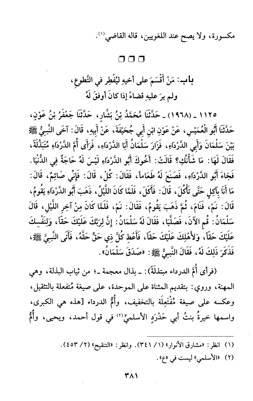 1125 - (1968) - حَدَّثَنَا مُحَمَّدُ بْنُ بَشَّارٍ، حَدَّثَنَا جَعْفَرُ بْنُ عَوْنٍ، حَدَّثَنَا أَبُو الْعُمَيْسِ، عَنْ عَوْنِ ابْنِ أَبي جُحَيْفَةَ، عَنْ أَبِيهِ، قَالَ: آخَى النَّبِيُّ - صلى الله عليه وسلم - بَيْنَ سَلْمَانَ وَأَبِي الدَّرْدَاءِ، فَزَارَ سَلْمَانُ أَبَا الدَّرْدَاءِ، فَرَأَى أُمَّ الدَّرْدَاءِ مُتبَذِّلَةً، فَقَالَ لَهَا: مَا شَأْنُكِ؟ قَالَتْ: أَخُوكَ أَبُو الدَّرْدَاءَ لَيْسَ لَهُ حَاجَةٌ فِي الدُّنْيَا. فَجَاءَ أَبُو الدَّرْدَاءِ، فَصَنَعَ لَهُ طَعَامًا، فَقَالَ: كُلْ، قَالَ: فَإِنِّي صَائِمٌ، قَالَ: مَا أَنَا بِآكِلٍ حَتَّى تَأْكُلَ، قَالَ: فَأَكَلَ، فَلَمَّا كَانَ اللَّيْلُ، ذَهَبَ أَبُو الدَّرْدَاءَ يَقُومُ، قَالَ: نَمْ، فَنَامَ، ثُمَّ ذَهَبَ يَقُومُ، فَقَالَ: نَمْ، فَلَمَّا كَانَ مِنْ آخِرِ اللَّيْلِ، قَالَ سَلْمَانُ: قُمِ الآنَ، فَصَلَّيَا، فَقَالَ لَهُ سَلْمَانُ: إِن لِرَبِّكَ عَلَيْكَ حَقًّا، وَلِنَفْسِكَ عَلَيْكَ حَقًّا، وَلأَهْلِكَ عَلَيْكَ حَقًّا، فَأَعْطِ كُلَّ ذِي حَقِّ حَقَّهُ، فَأتى النَّبِيَّ - صلى الله عليه وسلم -، فَذَكرَ ذَلِكَ لَهُ، فَقَالَ النَّبِيُّ - صلى الله عليه وسلم -: "صَدَقَ سَلْمَانُ".