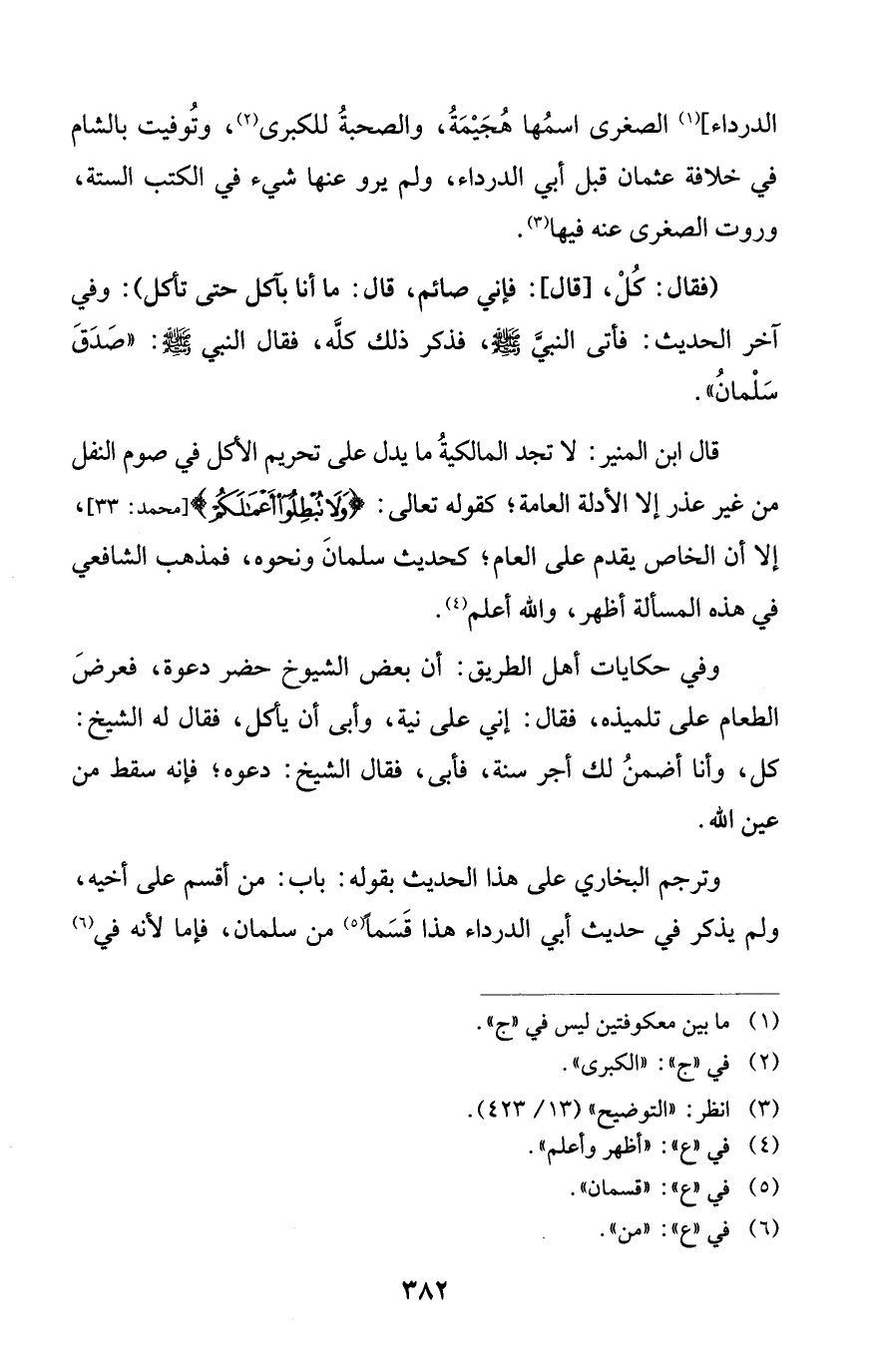 قال ابن المنير: لا تجد المالكيةُ ما يدل على تحريم الأكل في صوم النفل من غير عذر إلا الأدلة العامة؛ كقوله تعالى: {وَلَا تُبْطِلُوا أَعْمَالَكُمْ} [محمد: 33]، إلا أن الخاص يقدم على العام؛ كحديث سلمانَ ونحوه، فمذهب الشافعي في هذه المسألة أظهر، والله أعلم (¬4).