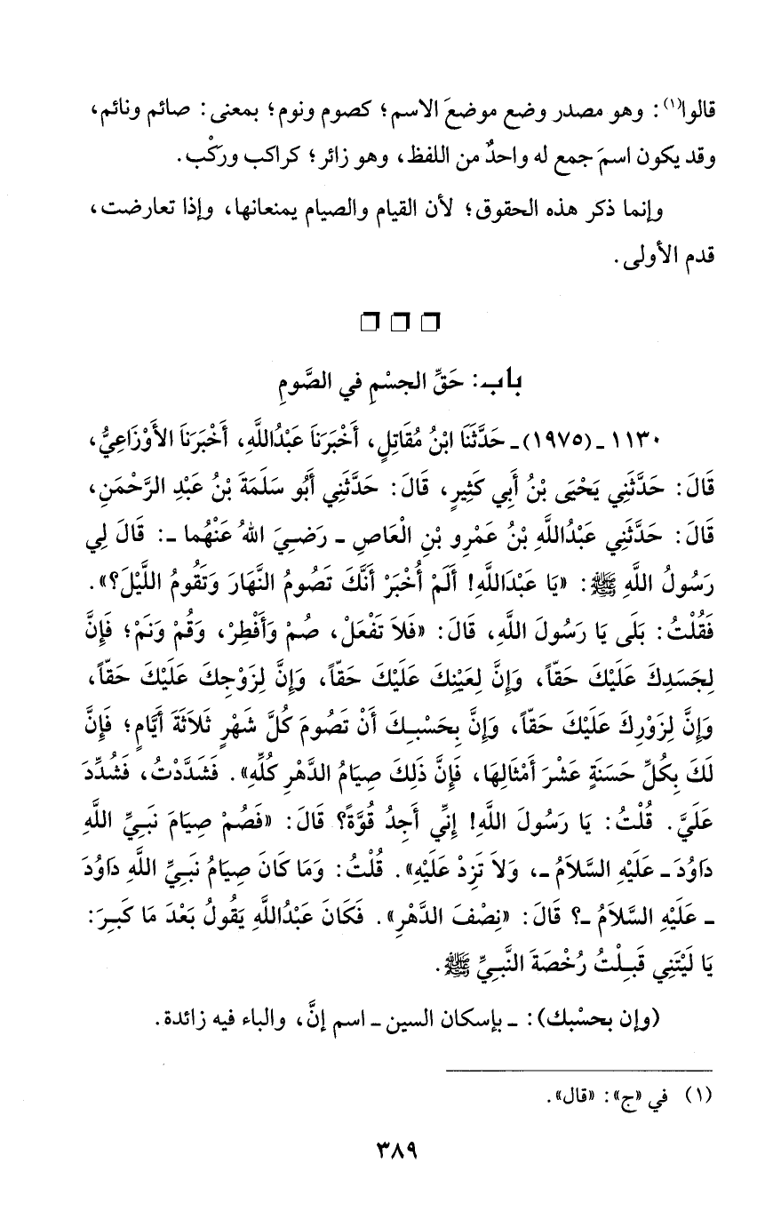 1130 - (1975) - حَدَّثَنَا ابْنُ مُقَاتِلٍ، أَخْبَرَنَا عَبْدُ اللَّهِ، أَخْبَرَنَا الأَوْزَاعِيُّ، قَالَ: حَدَّثَنِي يَحْيىَ بْنُ أبي كَثِيرٍ، قَالَ: حَدَّثَنِي أَبُو سَلَمَةَ بْنُ عَبْدِ الرَّحْمَنِ، قَالَ: حَدَّثَنِي عَبْدُ اللَّهِ بْنُ عَمْرِو بْنِ الْعَاصِ - رَضِيَ اللهُ عَنْهُما -: قَالَ لِي رَسُولُ اللهِ - صلى الله عليه وسلم -: "يَا عَبْدَ اللَّهِ! أَلَمْ أُخْبَرْ أَنَّكَ تَصُومُ النَّهَارَ وَتَقُومُ اللَّيْلَ؟ ". فَقُلْتُ: بَلَى يَا رَسُولَ اللهِ، قَالَ: "فَلاَ تَفْعَلْ، صُمْ وَأَفْطِرْ، وَقُمْ وَنَمْ؛ فَإِنَّ لِجَسَدِكَ عَلَيْكَ حَقًّا، وَإِنَّ لِعَيْنِكَ عَلَيْكَ حَقًّا، وَإِنَّ لِزَوْجِكَ عَلَيْكَ حَقًّا، وَإِنَّ لِزَوْرِكَ عَلَيْكَ حَقًّا، وَإِنَّ بِحَسْبِكَ أَنْ تَصُومَ كُلَّ شَهْرٍ ثَلاَثَةَ أَيَّامٍ؛ فَإِنَّ لَكَ بِكُلِّ حَسَنَةٍ عَشْرَ أَمْثَالِهَا، فَإِنَّ ذَلِكَ صِيَامُ الدَّهْرِ كلِّهِ". فَشَدَّدْتُ، فَشُدِّدَ عَلَيَّ. قُلْتُ: يَا رَسُولَ اللهِ! إِنِّي أَجِدُ قُوَّةً؟ قَالَ: "فَصُمْ صِيَامَ نبَيِّ اللهِ دَاوُدَ - عَلَيْهِ السَّلاَمُ -، وَلاَ تَزِدْ عَلَيْهِ". قُلْتُ: وَمَا كَانَ صِيَامُ نبَيِّ اللهِ دَاوُدَ - عَلَيْهِ السَّلاَمُ -؟ قَالَ: "نِصْفَ الدَّهْرِ". فَكَانَ عَبْدُ اللَّهِ يَقُولُ بَعْدَ مَا كبِرَ: يَا لَيْتَنِي قَبِلْتُ رُخْصَةَ النَّبِيِّ - صلى الله عليه وسلم -.