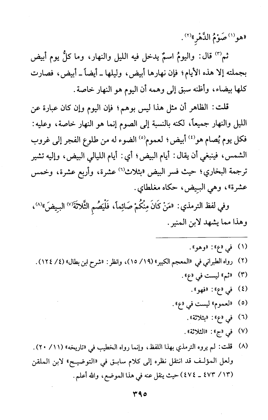 قلت: الظاهر أن مثل هذا ليس بوهم؛ فإن اليوم وإن كان عبارة عن الليل والنهار جميعًا، لكنه بالنسبة إلى الصوم إنما هو النهار خاصة، وعليه: فكل يوم يُصام هو (¬4) أبيض؛ لعموم (¬5) الضوء له من طلوع الفجر إلى غروب الشمس، فينبغي أن يقال: أيام البيض؛ أي: أيام الليالي البيض، وإليه تشير ترجمة البخاري؛ حيث فسر البيض "بثلاث (¬6) عشرة، وأربع عشرة، وخمس عشرة"، وهي البِيض، حكاه مغلطاي.