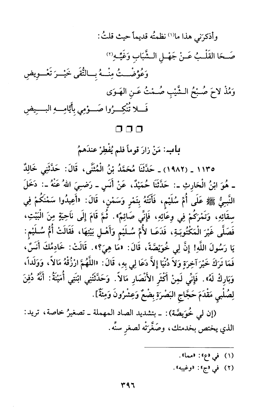 1135 - (1982) - حَدَّثَنَا مُحَمَّدُ بْنُ الْمُثَنَّى، قَالَ: حَدَّثَنِي خَالِدٌ - هُوَ ابْنُ الْحَارِثِ -: حَدَّثَنَا حُمَيْدٌ، عَنْ أَنسٍ - رَضِيَ اللهُ عَنْهُ -: دَخَلَ النَّبِيُّ - صلى الله عليه وسلم - عَلَى أُمِّ سُلَيْمٍ، فَأَتَتْهُ بِتَمْرٍ وَسَمْنٍ، قَالَ: "أَعِيدُوا سَمْنَكُمْ فِي سِقَائِهِ، وَتَمْرَكُمْ فِي وِعَائِهِ، فَإِنِّي صَائِمٌ". ثُمَّ قَامَ إِلَى نَاحِيَةٍ مِنَ الْبَيْتِ، فَصَلَّى غَيْرَ الْمَكْتُوبَةِ، فَدَعَا لأُمِّ سُلَيْمِ وَأَهْلِ بَيْتِهَا، فَقَالَتْ أُمُّ سُلَيْمٍ: يَا رَسُولَ اللهِ! إِنَّ لِي خُويْصَّةً، قَالَ: "مَا هِيَ؟ ". قَالَتْ: خَادِمُكَ أَنَسٌ، فَمَا تَرَكَ خَيْرَ آخِرَةٍ وَلاَ دُنْيَا إِلاَّ دَعَا لِي بِهِ، قَالَ: "اللَّهُمَّ ارْزُقْهُ مَالًا، وَوَلَدًا، وَبَارِكْ لَهُ". فَإِنِّي لَمِنْ أكثَرِ الأَنْصَارِ مَالًا. وَحَدَّثتنِي ابْنَتِي أمُيْنَةُ: أَنَّهُ دُفِنَ لِصُلْبيِ مَقْدَمَ حَجَّاجِ البَصْرَةِ بِضْعٌ وَعِشْرُونَ وَمِئَةٌ].