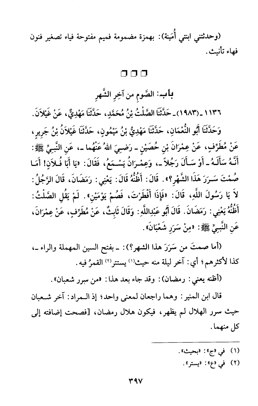 1136 - (1983) - حَدَّثَنَا الصَّلْتُ بْنُ مُحَمَّدٍ، حَدَّثَنَا مَهْدِيٌّ، عَنْ غَيْلاَنَ. وَحَدَّثَنَا أَبُو النُّعْمَانِ، حَدَّثَنَا مَهْدِيُّ بْنُ مَيْمُونٍ، حَدَّثَنَا غَيْلاَنُ بْنُ جَرِيرٍ، عَنْ مُطَرِّفٍ، عَنْ عِمْرَانَ بْنِ حُصَيْنٍ - رَضِيَ اللهُ عَنْهُما -، عَنِ النَّبِيِّ - صلى الله عليه وسلم -: أَنَّهُ سَأَلَهُ - أَوْ سَأَلَ رَجُلًا -، وَعِمْرَانُ يَسْمَعُ، فَقَالَ: "يَا أَبَا فُلاَنٍ! أَمَا صُمْتَ سَرَرَ هَذَا الشَّهْرِ؟ ". قَالَ: أَظُنُّهُ قَالَ: يَعْنِي: رَمَضَانَ، قَالَ الرَّجُلُ: لَا يَا رَسُولَ اللهِ، قَالَ: "فَإِذَا أَفْطَرْتَ، فَصُمْ يَوْمَيْنِ". لَمْ يَقُلِ الصَّلْتُ: أَظُنُّهُ يَعْنِي: رَمَضَانَ. قَالَ أَبُو عَبْدِ اللهِ: وَقَالَ ثَابِثٌ، عَنْ مُطَرِّفٍ، عَنْ عِمْرَانَ، عَنِ النَّبِيِّ - صلى الله عليه وسلم -: "مِنْ سَرَرِ شَعْبَانَ".