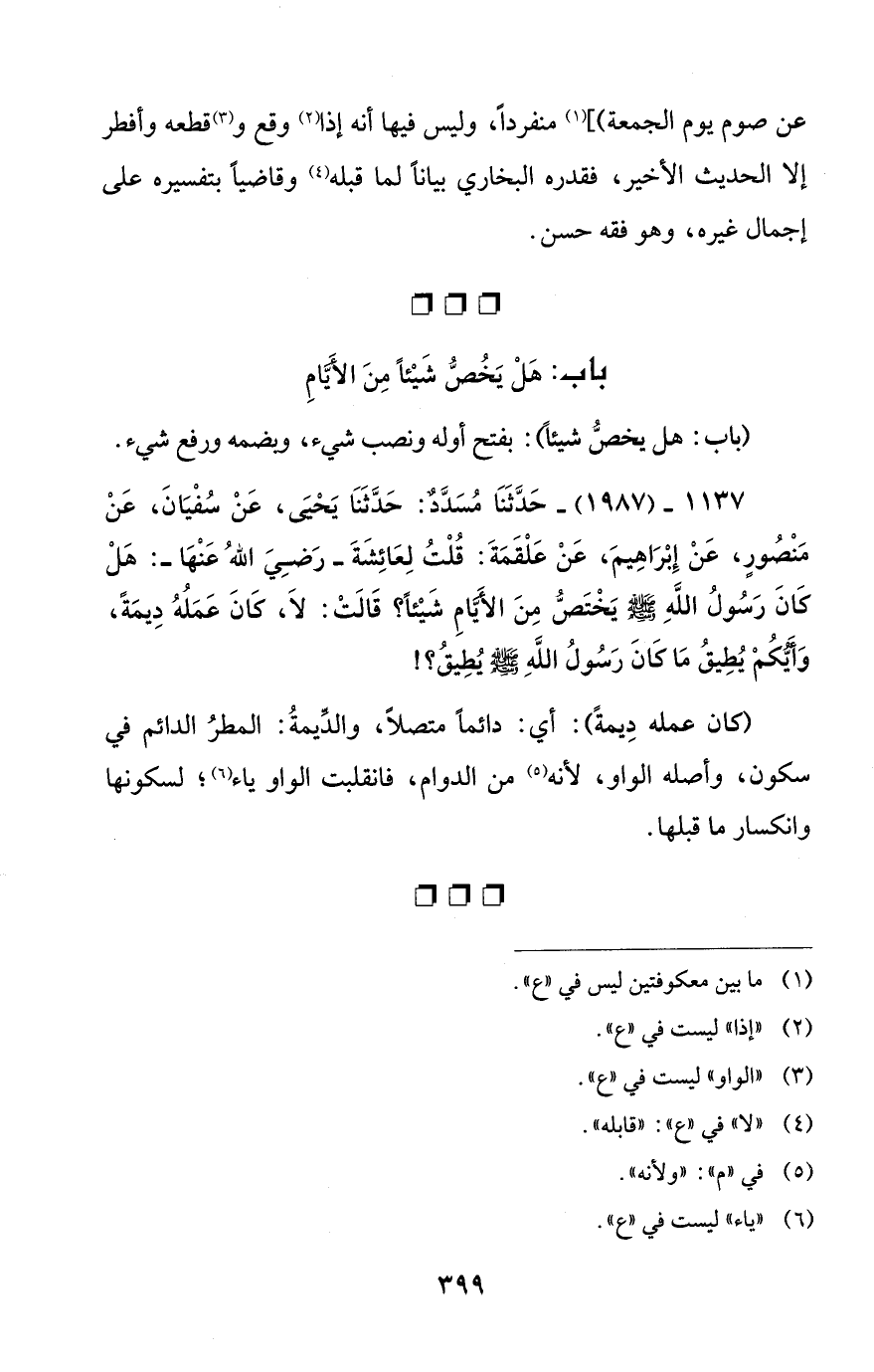 1137 - (1987) - حَدَّثَنَا مُسَدَّدٌ: حَدَّثَنَا يَحْيىَ، عَنْ سُفْيَانَ، عَنْ مَنْصُورٍ، عَنْ إِبْرَاهِيمَ، عَنْ عَلْقَمَةَ: قُلْتُ لِعَائِشَةَ - رَضِيَ اللهُ عَنْهَا -: هَلْ كَانَ رَسُولُ اللهِ - صلى الله عليه وسلم - يَخْتَصُّ مِنَ الأَيَّامِ شَيْئًا؟ قَالَت: لَا، كَانَ عَمَلُهُ دِيمَةً، وَأَيُّكُمْ يُطِيقُ مَا كَانَ رَسُولُ اللهِ -صلي الله عليه وسلم - يُطِيقُ؟!