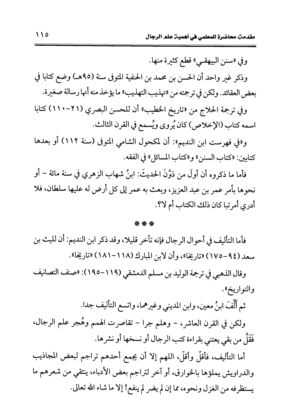 فأما التأليف في أحوال الرجال فإنه تأخر قليلا، وقد ذكر ابن النديم: أن لليث بن سعد (94 - 175) "تاريخا"، وأن لابن المبارك (118 - 181) "تاريخا".