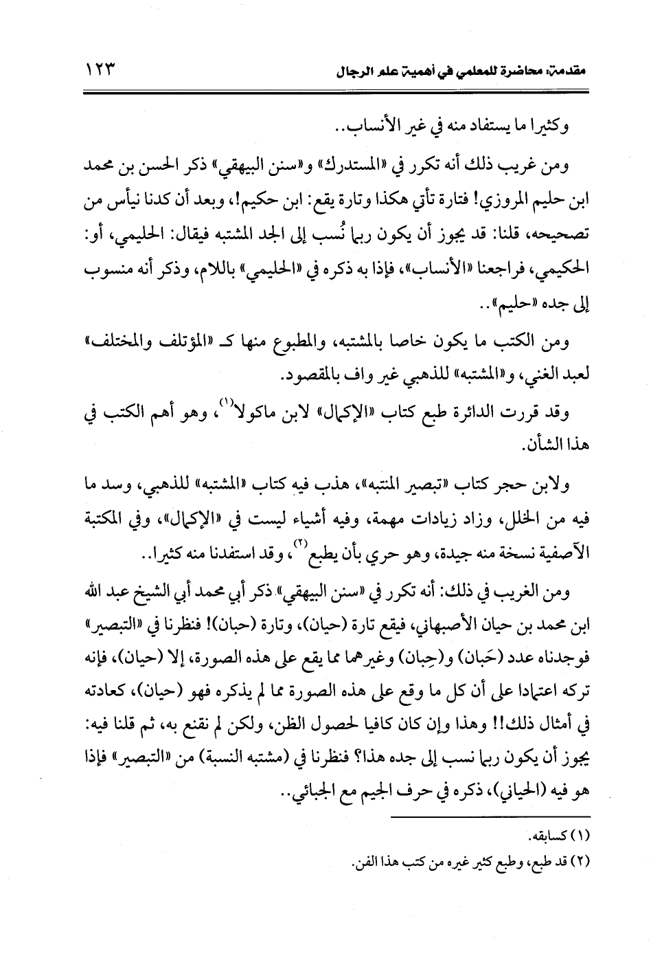 ومن الغريب في ذلك: أنه تكرر في "سنن البيهقي" ذكر أبي محمد أبي الشيخ عبد الله ابن محمد بن حيان الأصبهاني، فيقع تارة (حيان)، وتارة (حبان)! فنظرنا في "التبصير" فوجدناه عدد (حَبان) و (حِبان) وغيرهما مما يقع على هذه الصورة، إلا (حيان)، فإنه تركه اعتمادا على أن كل ما وقع على هذه الصورة مما لم يذكره فهو (حيان)، كعادته في أمثال ذلك!! وهذا وإن كان كافيا لحصول الظن، ولكن لم نقنع به، ثم قلنا فيه: يجوز أن يكون ربما نسب إلى جده هذا؟ فنظرنا في (مشتبه النسبة) من "التبصير" فإذا هو فيه (الحياني)، ذكره في حرف الجيم مع الجبائي ..
