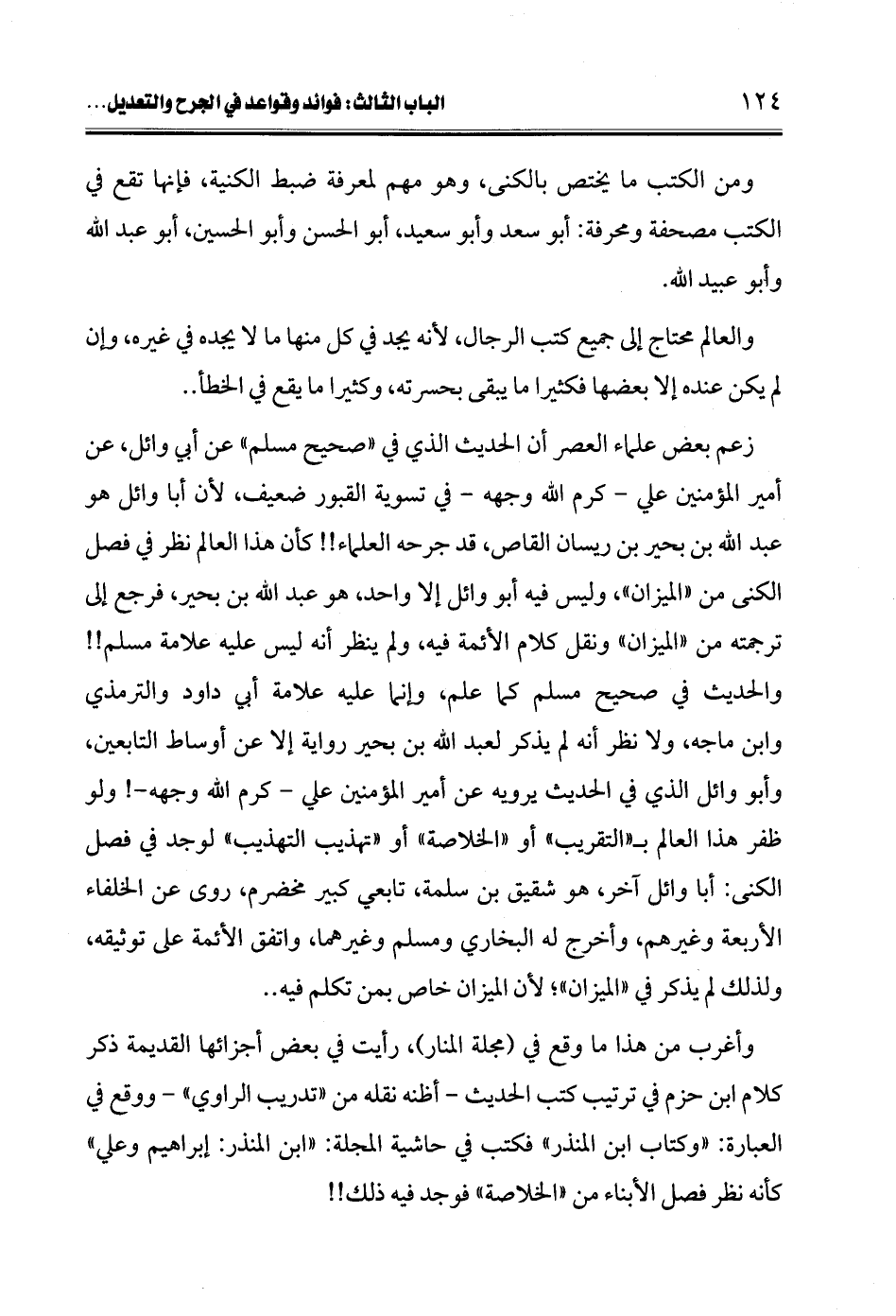 زعم بعض علماء العصر أن الحديث الذي في "صحيح مسلم" عن أبي وائل، عن أمير المؤمنين علي -كرم الله وجهه- في تسوية القبور ضعيف، لأن أبا وائل هو عبد الله بن بحير بن ريسان القاص، قد جرحه العلماء!! كأن هذا العالم نظر في فصل الكنى من "الميزان"، وليس فيه أبو وائل إلا واحد، هو عبد الله بن بحير، فرجع إلى ترجمته من "الميزان" ونقل كلام الأئمة فيه، ولم ينظر أنه ليس عليه علامة مسلم!! والحديث في صحيح مسلم كما علم، وإنما عليه علامة أبي داود والترمذي وابن ماجه، ولا نظر أنه لم يذكر لعبد الله بن بحير رواية إلا عن أوساط التابعين، وأبو وائل الذي في الحديث يرويه عن أمير المؤمنين علي -كرم الله وجهه-! ولو ظفر هذا العالم بـ "التقريب" أو"الخلاصة" أو"تهذيب التهذيب" لوجد في فصل الكنى: أبا وائل آخر، هو شقيق بن سلمة، تابعي كبير مخضرم، روى عن الخلفاء الأربعة وغيرهم، وأخرج له البخاري ومسلم وغيرهما، واتفق الأئمة على توثيقه، ولذلك لم يذكر في "الميزان"؛ لأن الميزان خاص بمن تكلم فيه ..
