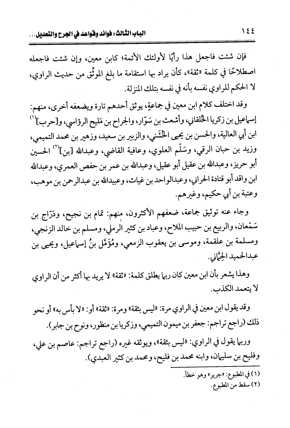 وهذا يشعر بأن ابن معين كان ربما يطلق كلمة: "ثقة" لا يريد بها أكثر من أن الراوي لا يتعمد الكذب.