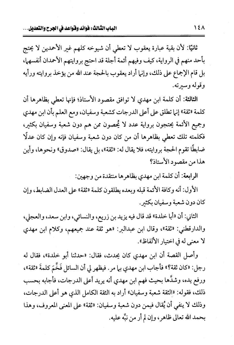 الثالثة: أن كلمة ابن مهدي لا توافق مقصود الأستاذ؛ فإنها تعطي بظاهرها أن كلمة "ثقة" إنما تطلق على أعلى الدرجات كشعبة وسفيان، ومع العلم بأن ابن مهدي وجميع الأئمة يحتجون برواية عدد لا يُحصون ممن هم دون شعبة وسفيان بكثير، فكلمته تلك تعطي بظاهرها أن من كان دون شعبة وسفيان فإنه وإن كان عدلًا، ضابطًا تقوم الحجة بروايته، فلا يقال له: "ثقة"، بل يقال: "صدوق" ونحوها، وأين هذا من مقصود الأستاذ؟