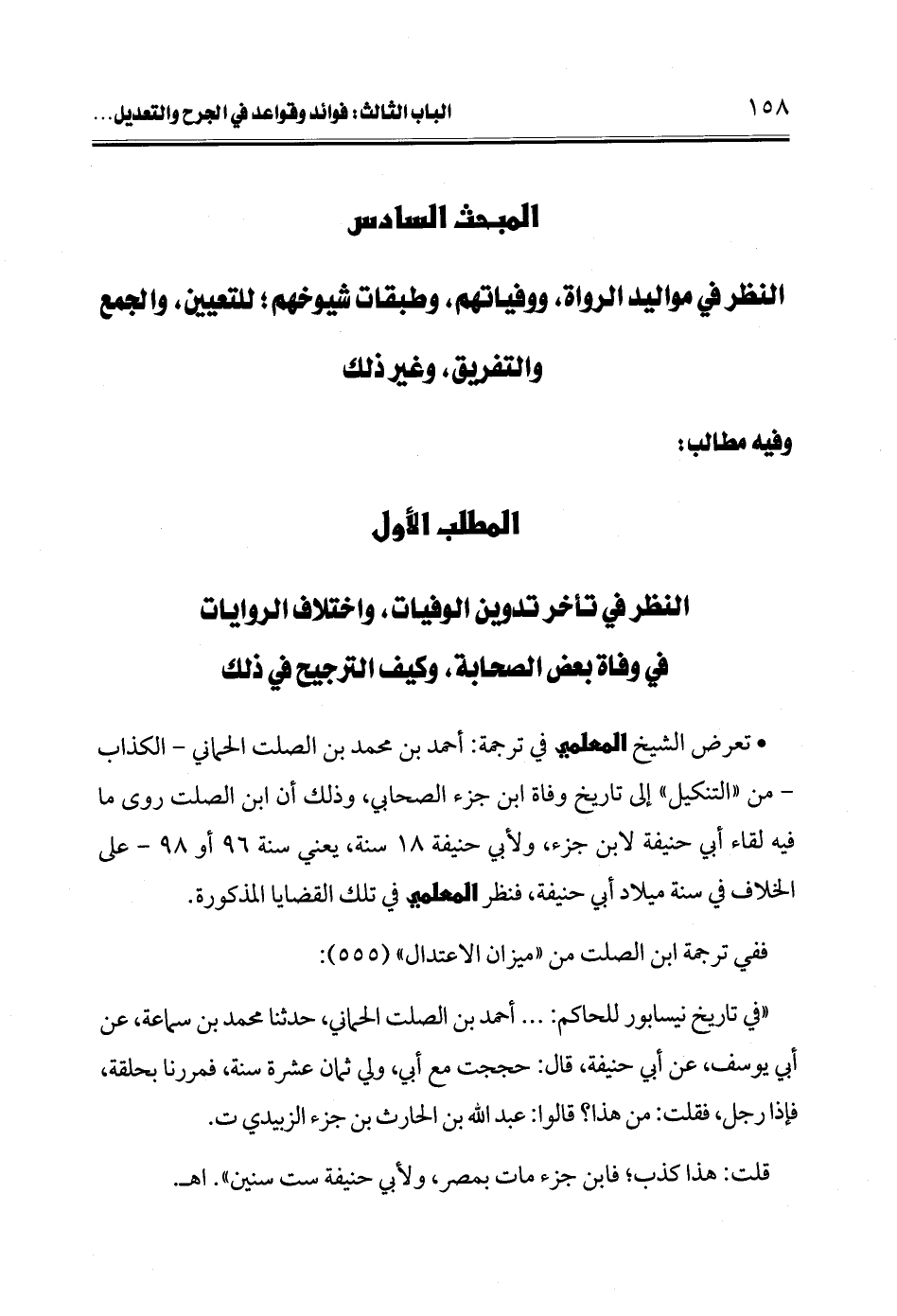 • تعرض الشيخ المعلمي في ترجمة: أحمد بن محمد بن الصلت الحماني -الكذاب- من "التنكيل" إلى تاريخ وفاة ابن جزء الصحابي، وذلك أن ابن الصلت روى ما فيه لقاء أبي حنيفة لابن جزء، ولأبي حنيفة 18 سنة، يعني سنة 96 أو 98 - على الخلاف في سنة ميلاد أبي حنيفة، فنظر المعلمي في تلك القضايا المذكورة.
