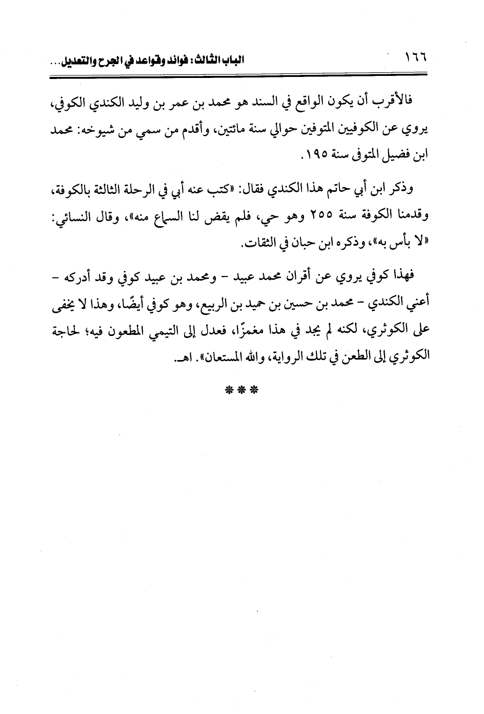 فهذا كوفي يروي عن أقران محمد عبيد -ومحمد بن عبيد كوفي وقد أدركه - أعني الكندي- محمد بن حسين بن حميد بن الربيع، وهو كوفي أيضًا، وهذا لا يخفى على الكوثري، لكنه لم يجد في هذا مغمزًا، فعدل إلى التيمي المطعون فيه؛ لحاجة الكوثري إلى الطعن في تلك الرواية، والله المستعان". اهـ.