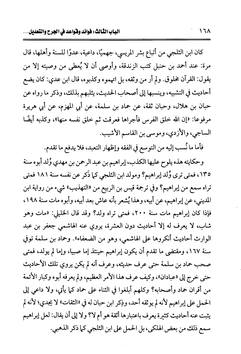 وحكايته هذه يلوح عليها الكذب، إبراهيم بن عبد الرحمن بن مهدي وُلد أبوه سنة 135، فمتى ترى وُلد إبراهيم؟ ومولد ابن الثلجي كما ذَكر عن نفسه سنة 181 فمتى تراه سمع من إبراهيم؟ وفي ترجمة قيس بن الربيع من "التهذيب" شيء من رواية ابن المديني، عن إبراهيم، عن أبيه، وهذا يُشعر بأنه عاش بعد أبيه، وأبوه مات سنة 198، فإذا كان إبراهيم مات سنة 200، فمتى تراه ولد؟ وقد قال الخليلي: "مات وهو شاب، لا يعرف له إلا أحاديث دون العشرة، يروي عنه الهاشمي جعفر بن عبد الوارث أحاديث أنكروها على الهاشمي، وهو من الضعفاء". وحماد بن سلمة توفىِ سنة 167، ومقتضى ما تقدم أن يكون إبراهيم حينئذ إما صبيا، وإما لم يولد، فمتى صحب حماد بن سلمة حتى عرف حديثه، وعرف أنه لم يكن يروي تلك الأحاديث حتى خرج إلى "عبادان"، وكيف عرف هذا الأمر العظيم، ولم يعرفه أبوه وكبار الأئمة من أقران حماد وأصحابه؟ وكلهم أبلغوا في الثناء على حماد كما يأتي، ولا داعي إلى الحمل على إبراهيم لأنه لم يوثقه أحد، وذِكر ابن حبان له في "الثقات" لا يجدي؛ لأنه لم يثبت عنه أحاديث كثيرة يعرف باعتبارها أثقة هو أم لا؟ ولا إلى أن يقال: لعل إبراهيم سمع ذلك من بعض الهلكى، بل الحمل على ابن الثلجي كما ذكر الذهبي.