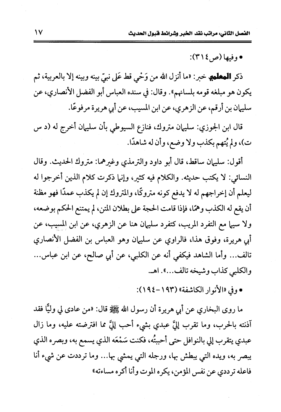 ذكر المعلمي خبر: "ما أنزل الله من وَحْي قط عَلى نبيّ بينه وبينه إلا بالعربية، ثم يكون هو مبلغه قومه بلسانهم". وقال: في سنده العباس أبو الفضل الأنصاري، عن سليمان بن أرقم، عن الزهري، عن ابن المسيب، عن أبي هريرة مرفوعًا.