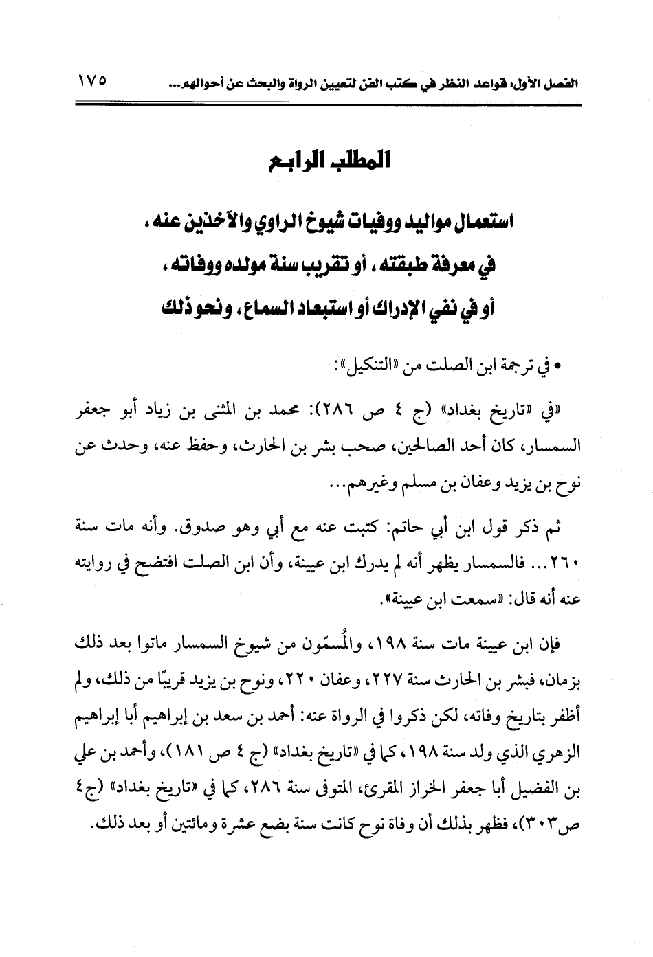 فإن ابن عيينة مات سنة 198، والمُسمّون من شيوخ السمسار ماتوا بعد ذلك بزمان، فبشر بن الحارث سنة 227، وعفان 220، ونوح بن يزيد قريبًا من ذلك، ولم أظفر بتاريخ وفاته، لكن ذكروا في الرواة عنه: أحمد بن سعد بن إبراهيم أبا إبراهيم الزهري الذي ولد سنة 198، كما في "تاريخ بغداد" (ج 4 ص 181)، وأحمد بن علي بن الفضيل أبا جعفر الخراز المقرىء، المتوفى سنة 286، كما في "تاريخ بغداد" (ج 4 ص 303)، فظهر بذلك أن وفاة نوح كانت سنة بضع عشرة ومائتين أو بعد ذلك.