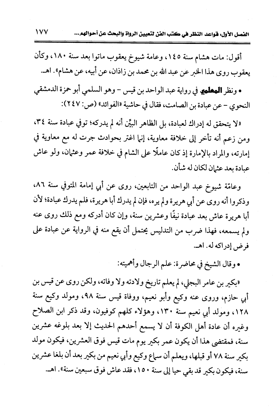 • ونظر المعلمي في رواية عبد الواحد بن قيس -وهو السلمي أبو حمزة الدمشقي النحوي- عن عبادة بن الصامت، فقال في حاشية "الفوائد" (ص: 247):