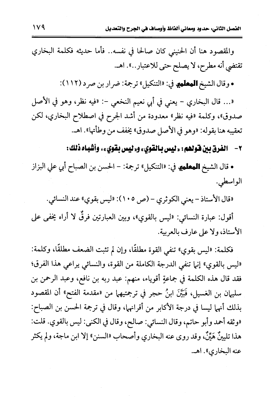 فكلمة: "ليس بقوي" تنفي القوة مطلقًا، وإن لم تثبت الضعف مطلقًا، وكلمة: "ليس بالقوي" إنما تنفي الدرجة الكاملة من القوة، والنسائي يراعي هذا الفرق؛ فقد قال هذه الكلمة في جماعةٍ أقوياء، منهم: عبد ربه بن نافع، وعبد الرحمن بن سليمان بن الغسيل، فَبَيَّنَ ابنُ حجر في ترجمتيهما من "مقدمة الفتح" أن المقصود بذلك أنهما ليسا في درجة الأكابر من أقرانهما، وقال في ترجمة الحسن بن الصباح: "وثقه أحمد وأبو حاتم، وقال النسائي: صالح، وقال في الكنى: ليس بالقوي. قلت: هذا تليينٌ هَيِّنٌ، وقد روى عنه البخاري وأصحاب "السنن" إلا ابن ماجة، ولم يكثر عنه البخاري". اهـ.