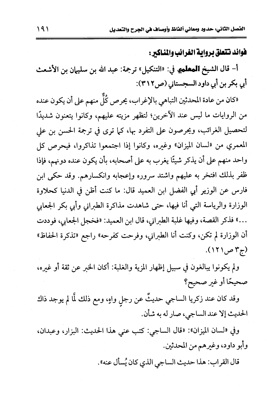 "كان من عادة المحدئين التباهي بالإغراب، يحرص كُلٌّ منهم على أن يكون عنده من الروايات ما ليس عند الآخرين؛ لتظهر مزيته عليهم، وكانوا يتعنون شديدًا لتحصيل الغرائب، ويحرصون على التفرد بها، كما ترى في ترجمة الحسن بن علي المعمري من "لسان الميزان" وغيره، وكانوا إذا اجتمعوا تذاكروا، فيحرص كل واحد منهم على أن يذكر شيئًا يغرب به على أصحابه، بأن يكون عنده دونهم، فإذا ظفر بذلك افتخر به عليهم واشتد سروره وإعجابه وانكسارهم. وقد حكى ابن فارس عن الوزير أبي الفضل ابن العميد قال: ما كنت أظن في الدنيا كحلاوة الوزارة والرياسة التي أنا فيها، حتى شاهدت مذاكرة الطبراني وأبي بكر الجعابي ... " فذكر القصة، وفيها غلبة الطبراني، قال ابن العميد: "فخجل الجعابي، فوددت أن الوزارة لم تكن، وكنت أنا الطبراني، وفرحت كفرحه" راجع "تذكرة الحفاظ" (ج 3 ص 121).