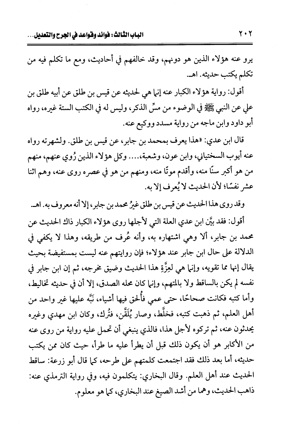 أقول: فقد بيَّن ابن عدي العلة التي لأجلها روى هؤلاء الكبار ذاك الحديث عن محمد بن جابر، ألا وهي اشتهاره به، وأنه عُرف من طريقه، وهذا لا يكفي في الدلالة على حال ابن جابر عند هؤلاء؛ فإن روايتهم عنه ليست بمستفيضة بحيث يقال إنها مما تقويه، وإنما هي لعِزَّةِ هذا الحديث وضيق مخرجه، ثم إن ابن جابر في نفسه لم يكن بالساقط ولا بالمتهم، وإنما كان محله الصدق، إلا أن في حديثه تخاليط، وأما كتبه فكانت صحاحًا، حتى عمي فأُلحق فيها أشياء، نَبَّه عليها غير واحد من أهل العلم، ثم ذهبت كتبه، فخلَّط، وصار يُلَقَّن، فتُرك، وكان ابن مهدي وغيره يحدثون عنه، ثم تركوه لأجل هذا، فالذي ينبغي أن تحمل عليه رواية من روى عنه من الأكابر هو أن يكون ذلك قبل أن يطرأ عليه ما طرأ، حيث كان ممن يكتب حديثه، أما بعد ذلك فقد اجتمعت كلمتهم على طرحه، كما قال أبو زرعة: ساقط الحديث عند أهل العلم. وقال البخاري: يتكلمون فيه، وفي رواية الترمذي عنه: ذاهب الحديث، وهما من أشد الصيغ عند البخاري، كما هو معلوم.