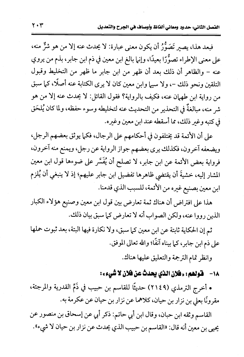 على أن الأئمة قد يختلفون في أحكامهم على الرجال، فكما يوثق بعضهم الرجل، ويضعفه آخرون، فكذلك يرى بعضهم جواز الرواية عن رجل، ويمنع منه آخرون، فرواية بعض الأئمة عن ابن جابر، لا تصلح أن يُفَسَّر على ضوءها قول ابن معين المشار إليه، خشيةَ أن يقتضي ظاهرها تفضيل ابن جابر عليهم؛ إذ لا ينبغي أن يُلزم ابن معين بصنيع غيره من الأئمة، للسبب الذي قدمنا.
