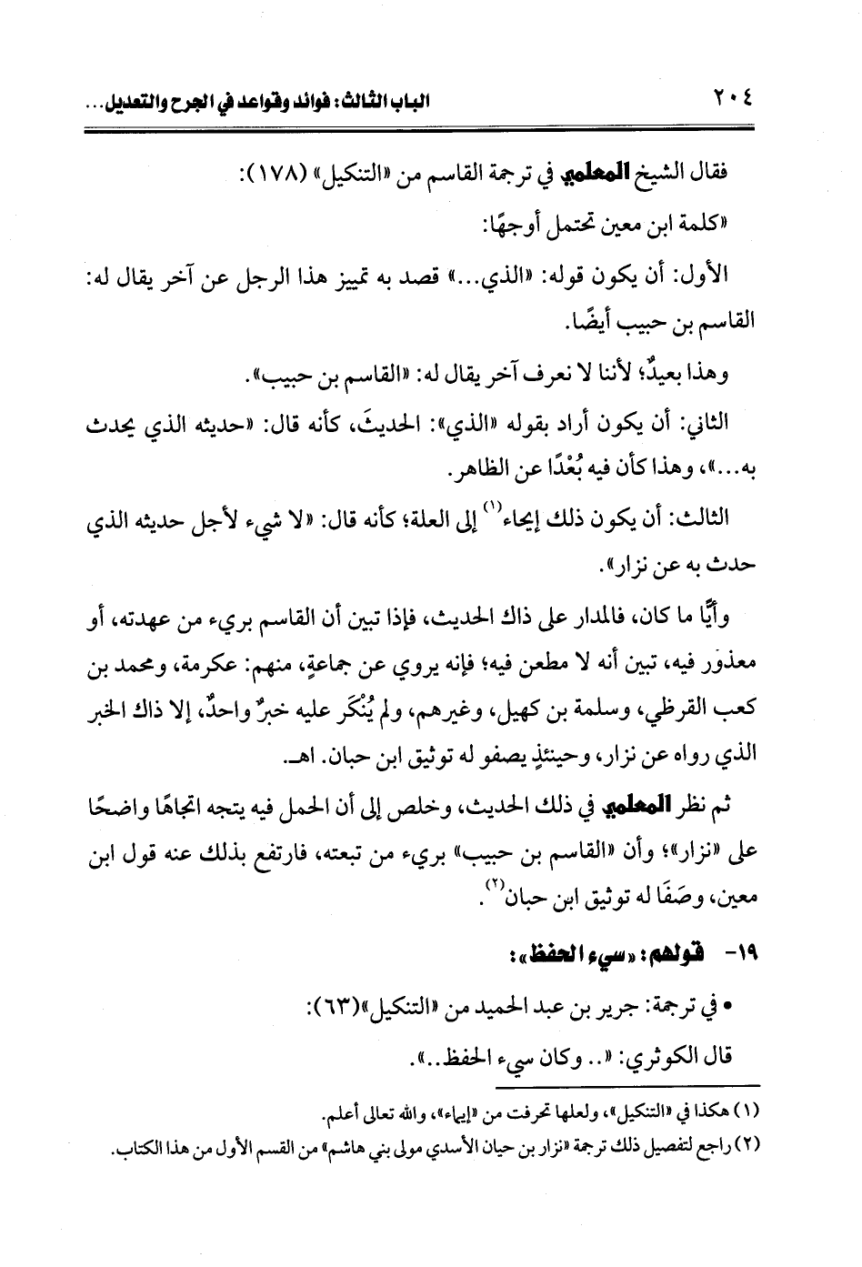 ثم نظر المعلمي في ذلك الحديث، وخلص إلى أن الحمل فيه يتجه اتجاهًا واضحًا على "نزار"؛ وأن "القاسم بن حبيب" بريء من تبعته، فارتفع بذلك عنه قول ابن معين، وصَفَا له توثيق ابن حبان (¬2).