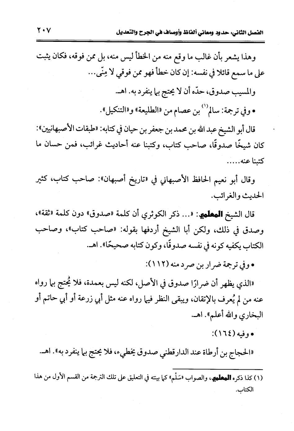 قال الشيخ المعلمي: " ... ذكر الكوثري أن كلمة "صدوق" دون كلمة "ثقة"، وصدق في ذلك، ولكن أبا الشيخ أردفها بقوله: "صاحب كتاب"، وصاحب الكتاب يكفيه كونه في نفسه صدوقًا، وكون كتابه صحيحًا". اهـ.